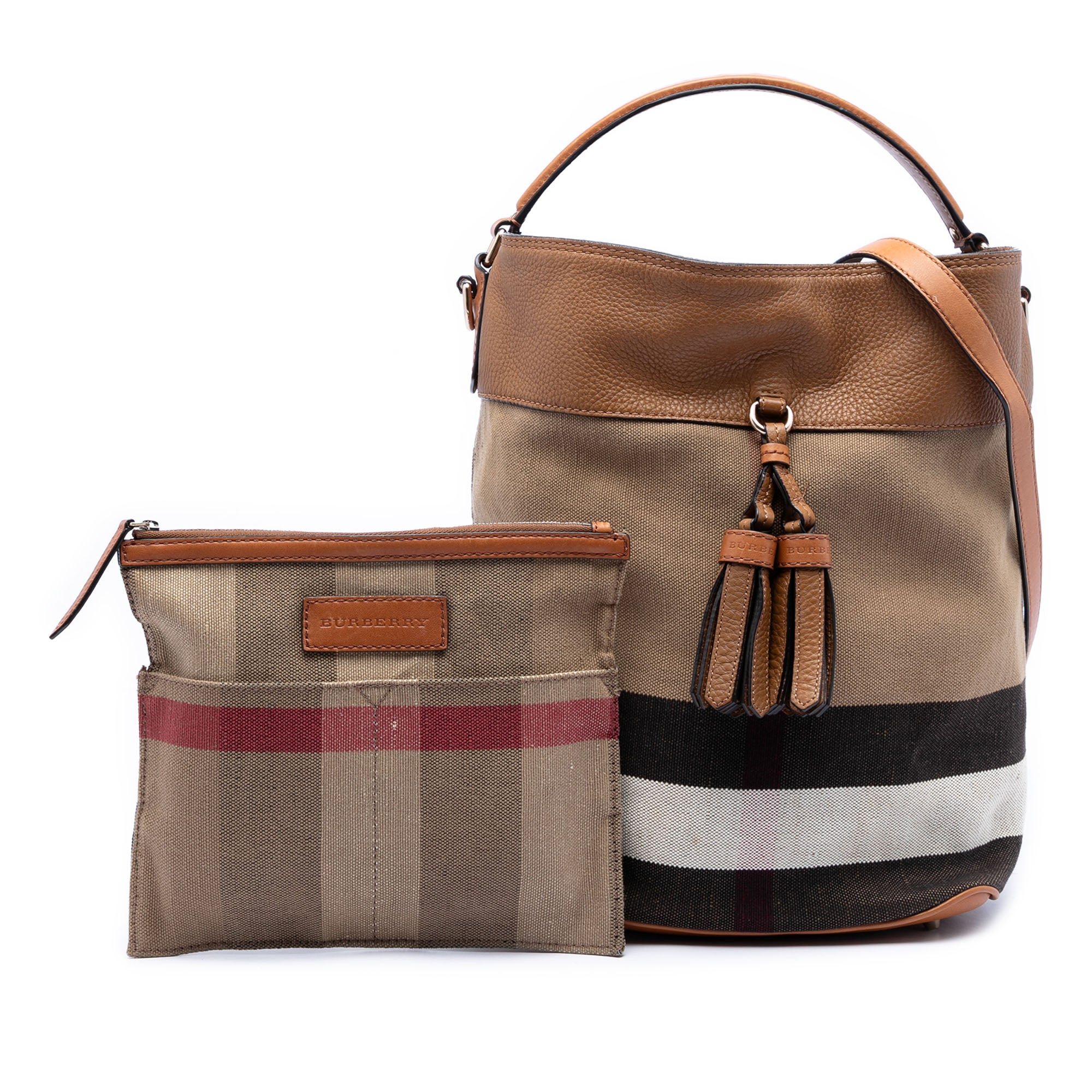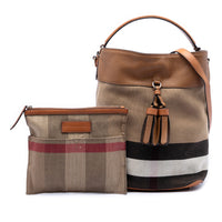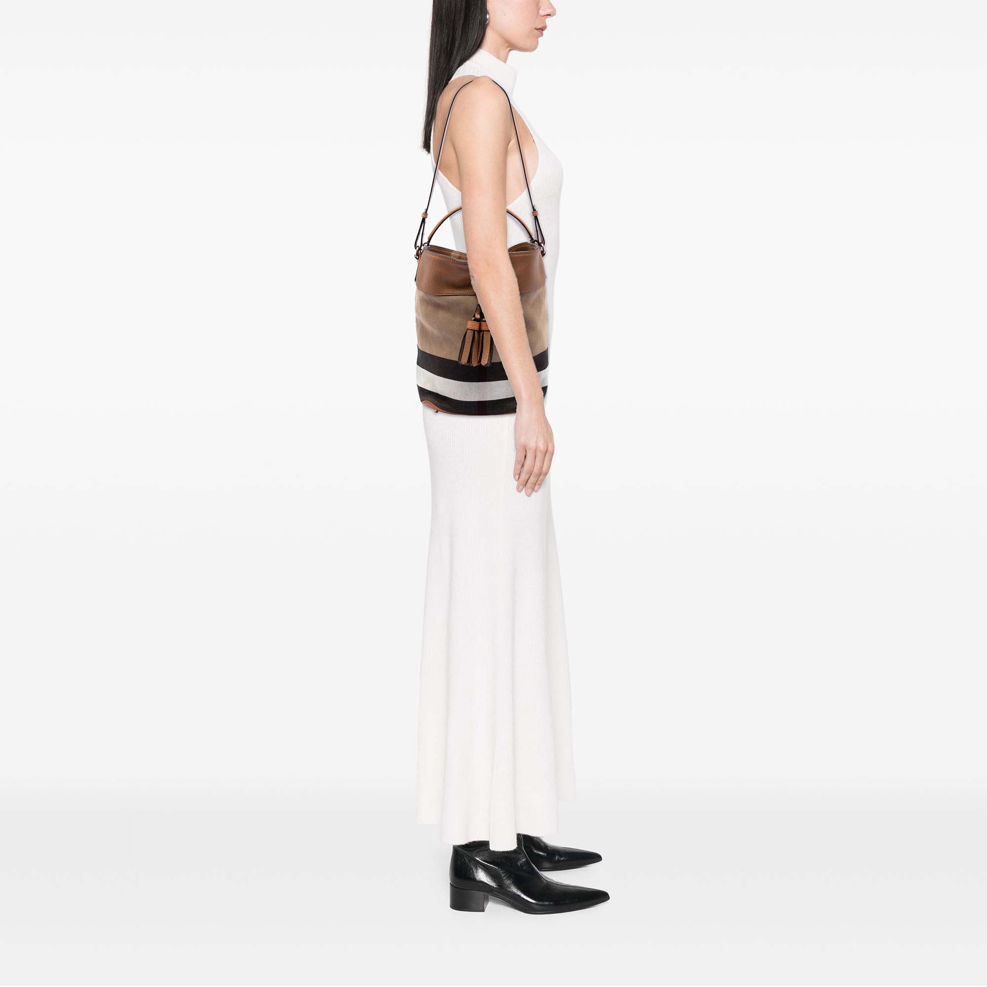 Die Burberry Medium Mega Check Canvas and Grained Calfskin Ashby Tassel Bucket Bag verbindet das ikonische Mega Check Muster auf robustem Canvas mit Besätzen aus genarbtem Kalbsleder. Die charakteristische Bucket-Form wirkt klar und funktional, akzentuiert durch Quasten-Details, die dem Design eine dezente Bewegung verleihen. Die Materialkombination sorgt für eine elegante Texturwirkung und eignet sich für einen stilvollen Alltagseinsatz mit britischer Handschrift.