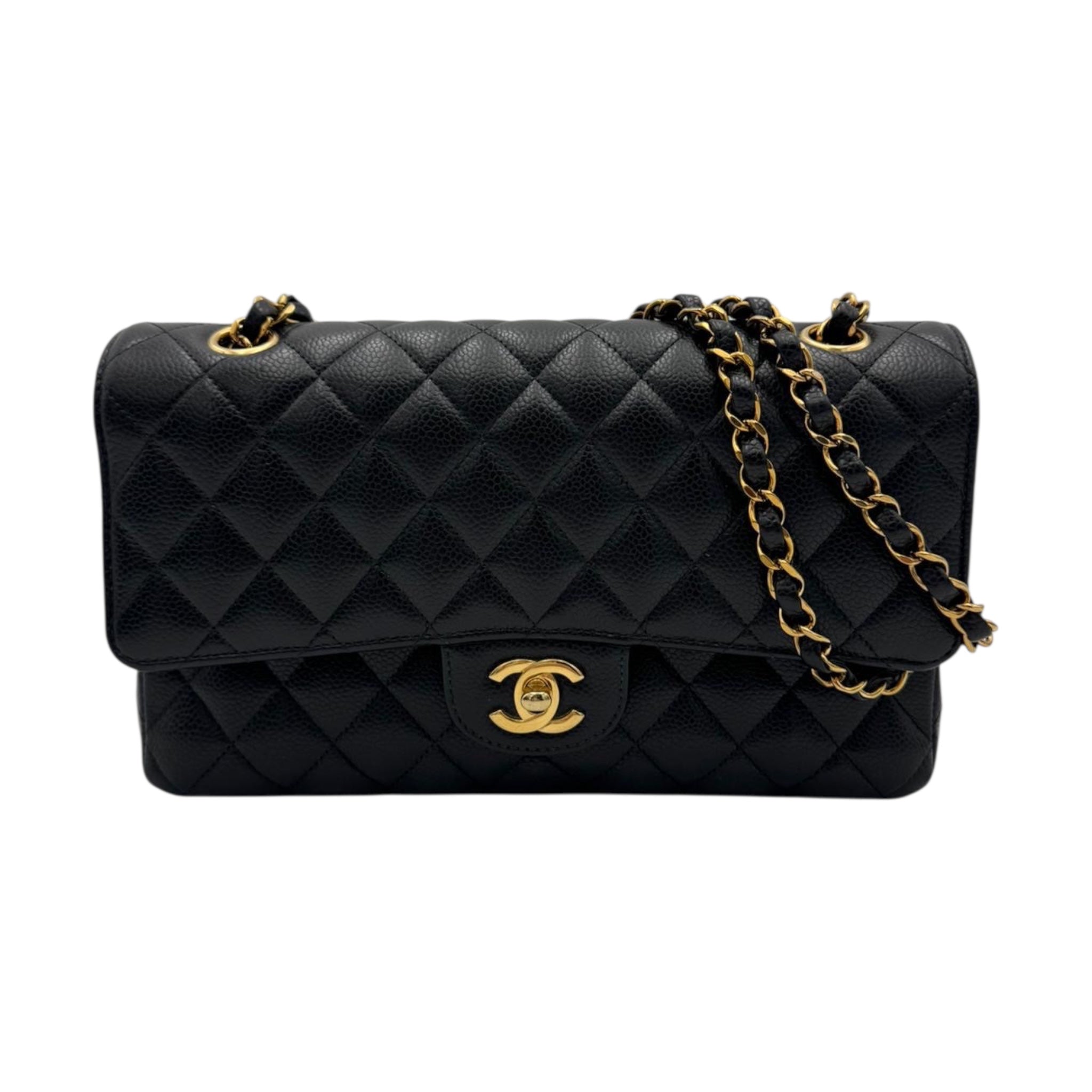 Bei der klassischen CHANEL-Schliesse wie auch beim Signet CHANEL CC selbst steht das linke C im unteren Bereich immer über dem rechten C. Im oberen Bereich befindet sich das linke C unter dem rechten C. Die klassische CC-Schliesse kann sowohl flach als auch gebogen sein. Einige klassische CC-Schliessen haben eine Art "gestanzte Prägung" auf einem der C. Ihre Position und ihr Aussehen variieren je nach Herstellungsjahr. Diese "Prägung" zeigt auch an, dass die Tasche in Frankreich hergestellt wurde. Bei klassischen CHANEL-Taschen, die in Italien hergestellt wurden, fehlt diese "Prägung" vollständig.