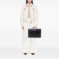 Die Bottega Veneta Nappa Intrecciato Briefcase ist eine Business-Tasche mit klarer, zurückhaltender Linienführung und dem charakteristischen Intrecciato-Flechtmuster. Das Modell wird aus weichem Nappa-Leder gefertigt und wirkt durch die präzise Webstruktur besonders kultiviert. Ein flacher Lederhenkel sorgt für komfortables Tragen in der Hand, während die Frontklappe mit Push-Lock-Verschluss einen sicheren, strukturierten Abschluss bietet.