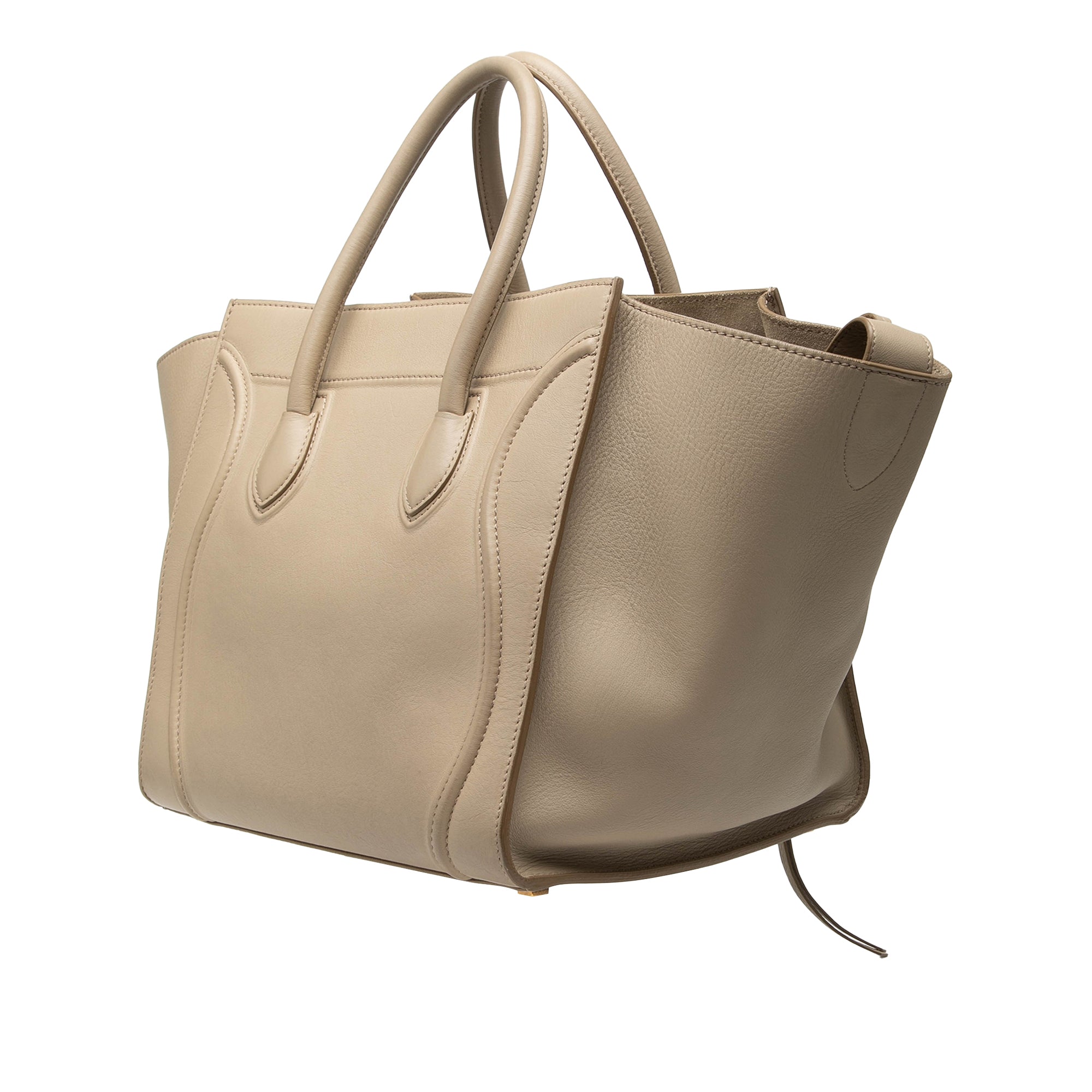Die Celine Medium Leather Luggage Phantom Tote interpretiert die charakteristische Luggage-Silhouette in einer weicheren, grosszuegigeren Form. Gefertigt aus hochwertigem Leder, wirkt das Design durch die geschwungenen Seiten und die markante Frontpartie modern und strukturiert zugleich. Rollierte Lederhenkel sorgen fuer eine angenehme Handhabung, waehrend die offene Oberkante schnellen Zugriff auf den Inhalt ermoeglicht.