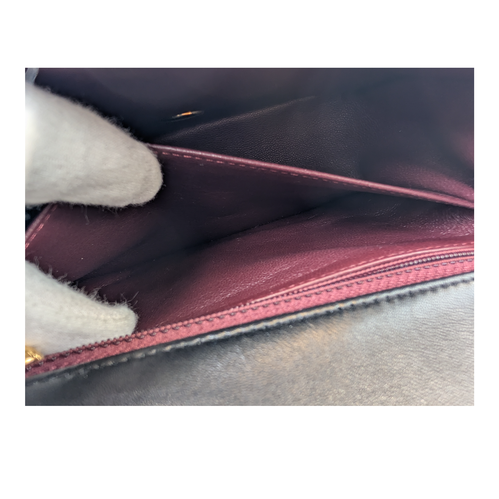 Zustand: Die Ecken und Kanten zeigen leichten Abrieb. Die Kanten der Taschenklappe weisen leichte Gebrauchsspuren auf. Das Leder zeigt vereinzelte feine Druckstellen und leichte Faltenbildung. Die Hardware weist feine Kratzer auf. Das Innenfach ist sauber.
