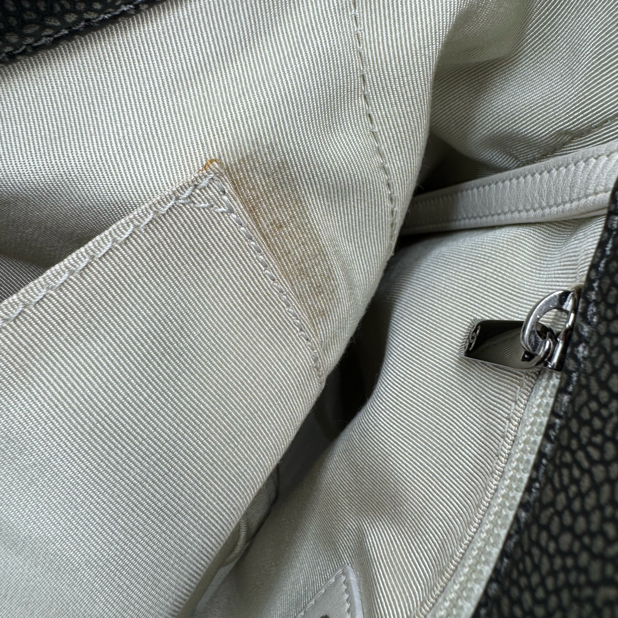 Zustand: Die Tasche befindet sich in sehr gutem Gesamtzustand. Die Seiten sind leicht unförmig. Die Ecken und Ränder weisen Abnutzung auf. Die Hardware ist teilweise noch foliert, teilweise mit Kratzer. Der Aussenboden hat feine Gebrauchsspuren. Im Innenraum zwei Flecke am Rand der Innentasche.