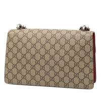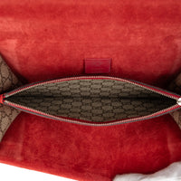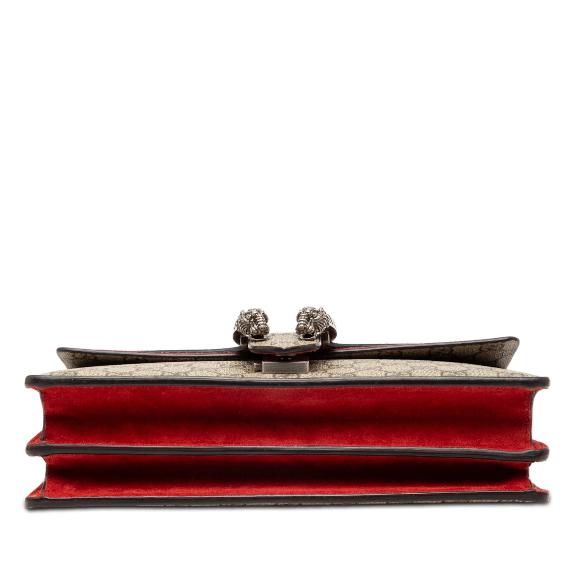 Dionysos, der griechische Gott des Weines und der Freude, steht Pate für die gleichnamige Kollektion aus dem Hause Gucci. Der Tigerkopf-Verschluss auf der Klappe dieser Tasche in der kleinen Grösse verweist auf die Legende, nach der Dionysos auf einem von Zeus gesandten Tiger den Tigris überquert haben soll. Zum anderen schafft die Hufeisen-Form der Schnalle einen Bezug zum Reitsport, der dem italienischen Modehaus nahe steht. Die Tasche wird über der Schulter getragen. Sie verfügt über einen silberfarbenen Kettenriemen, eine Klappe mit Schnappverschluss und ein Innenfach mit Reissverschluss.
