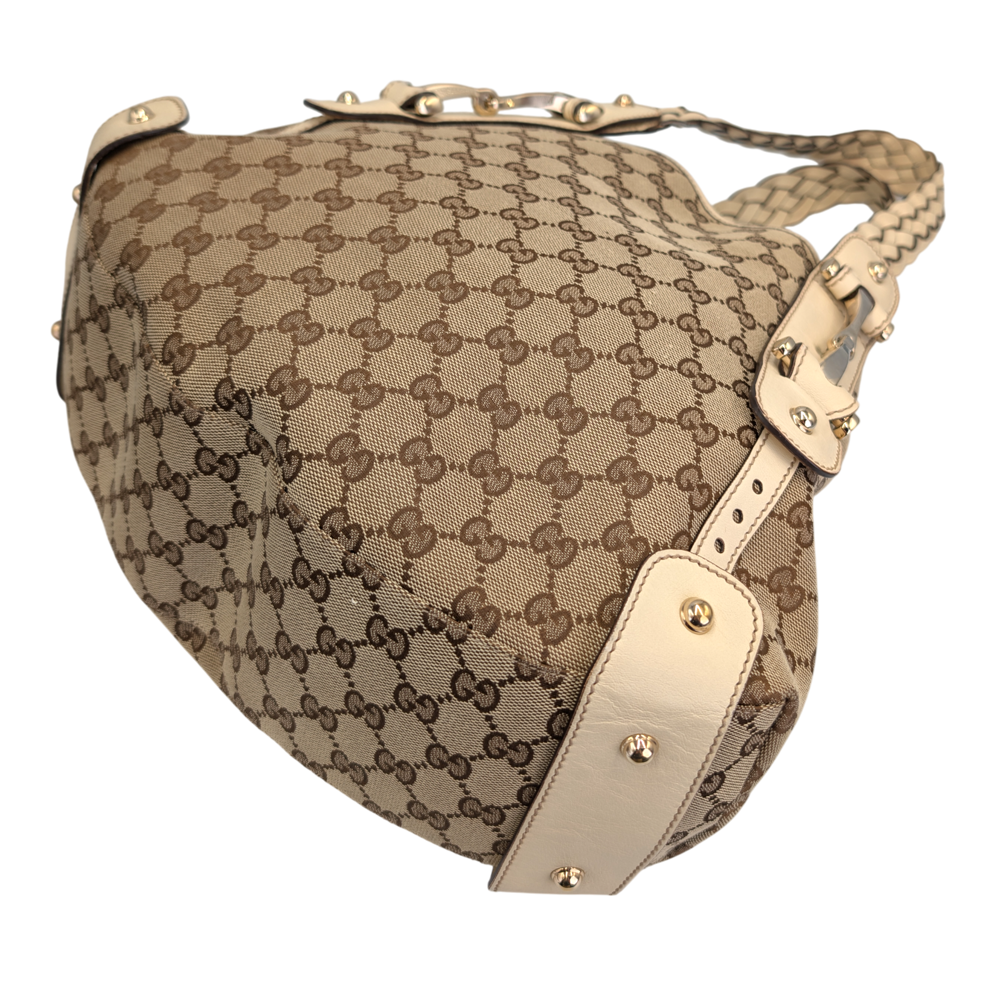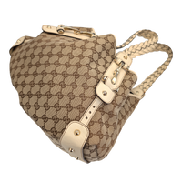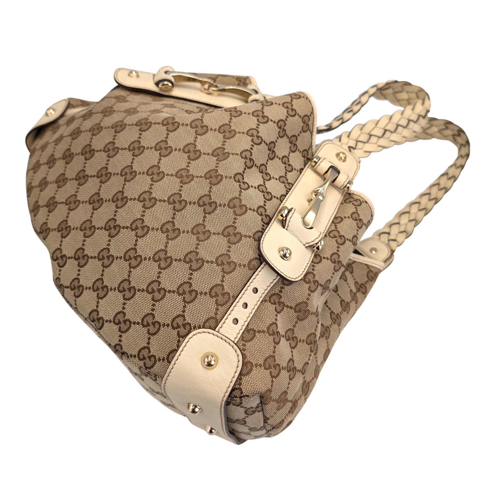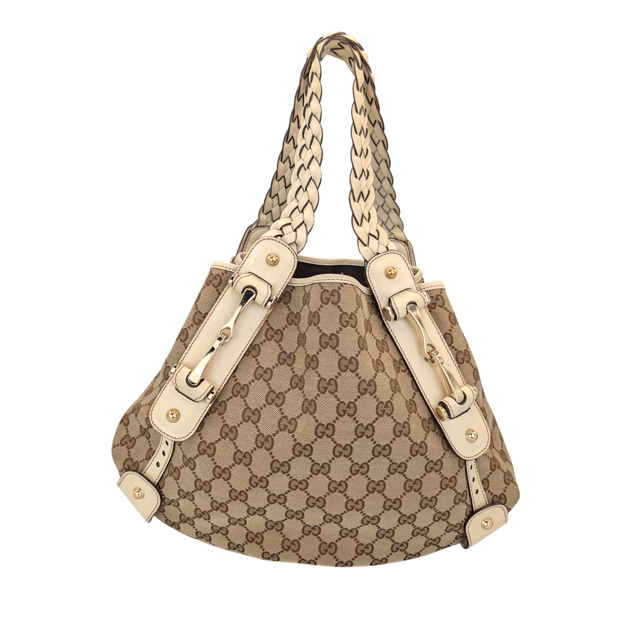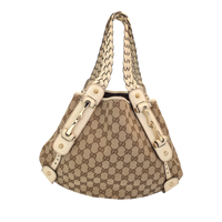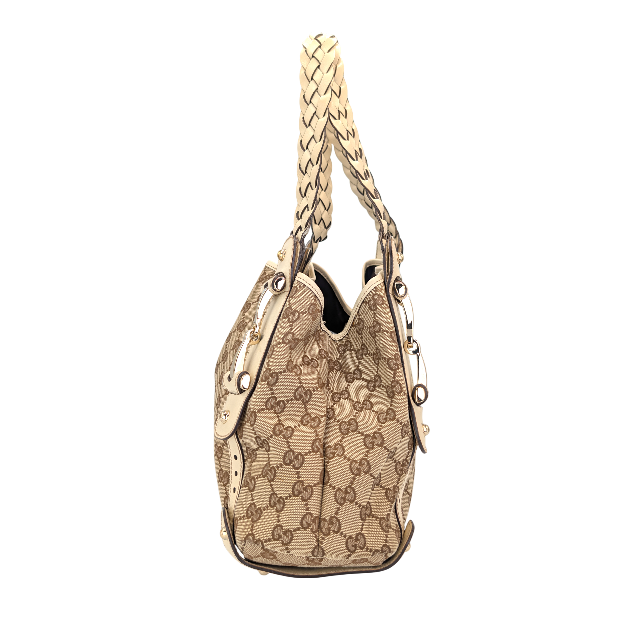 Die Gucci Pelham Tote ist ein klassisches Alltagsmodell aus dem ikonischen GG Canvas, kombiniert mit hellen Lederdetails und den charakteristischen geflochtenen Tragegriffen. Die weiche, leicht gerundete Form verleiht der Tasche eine feminine Silhouette, während die Hardware elegante Akzente setzt.