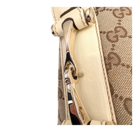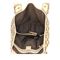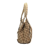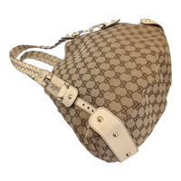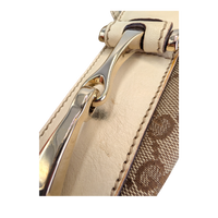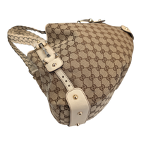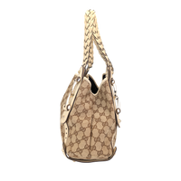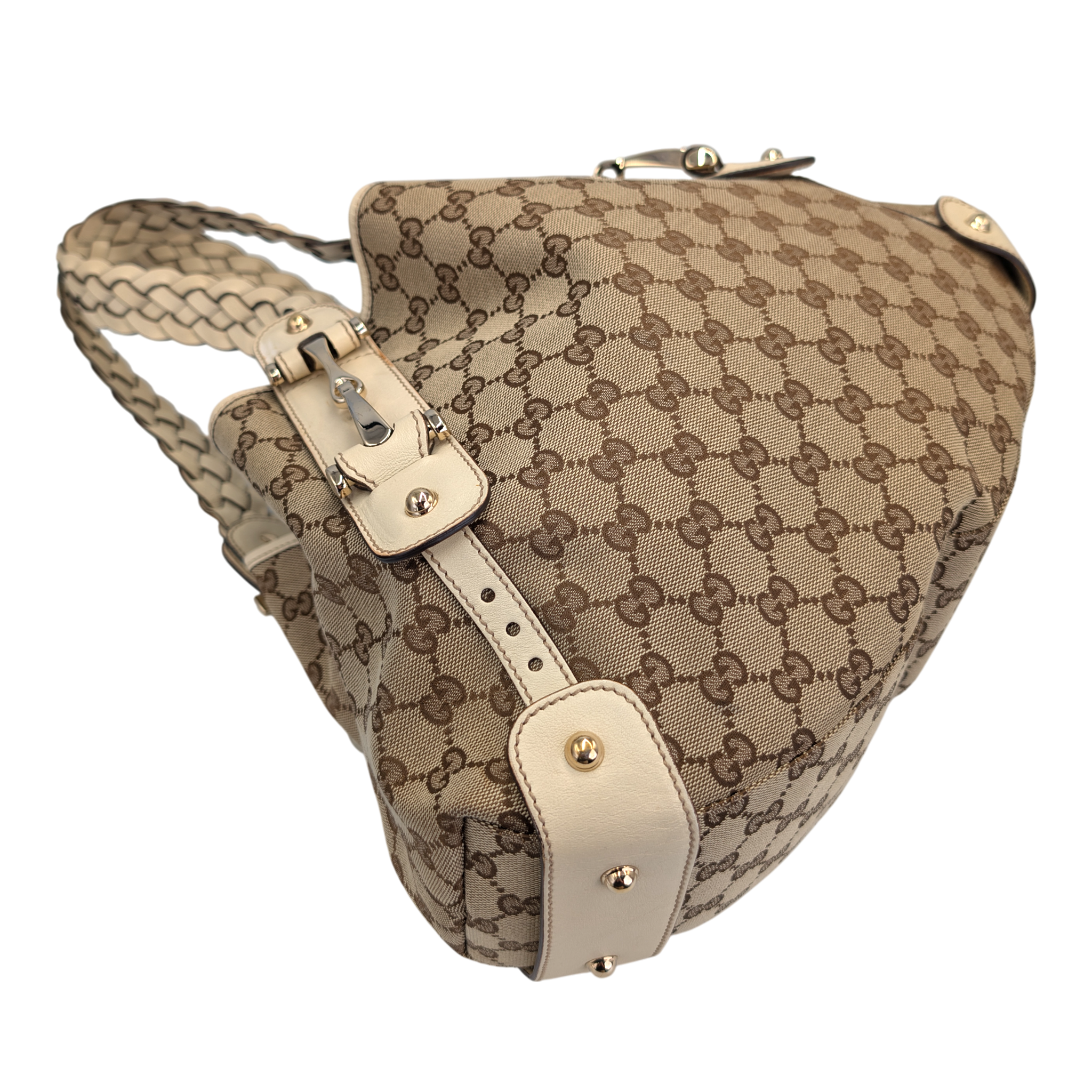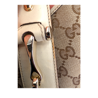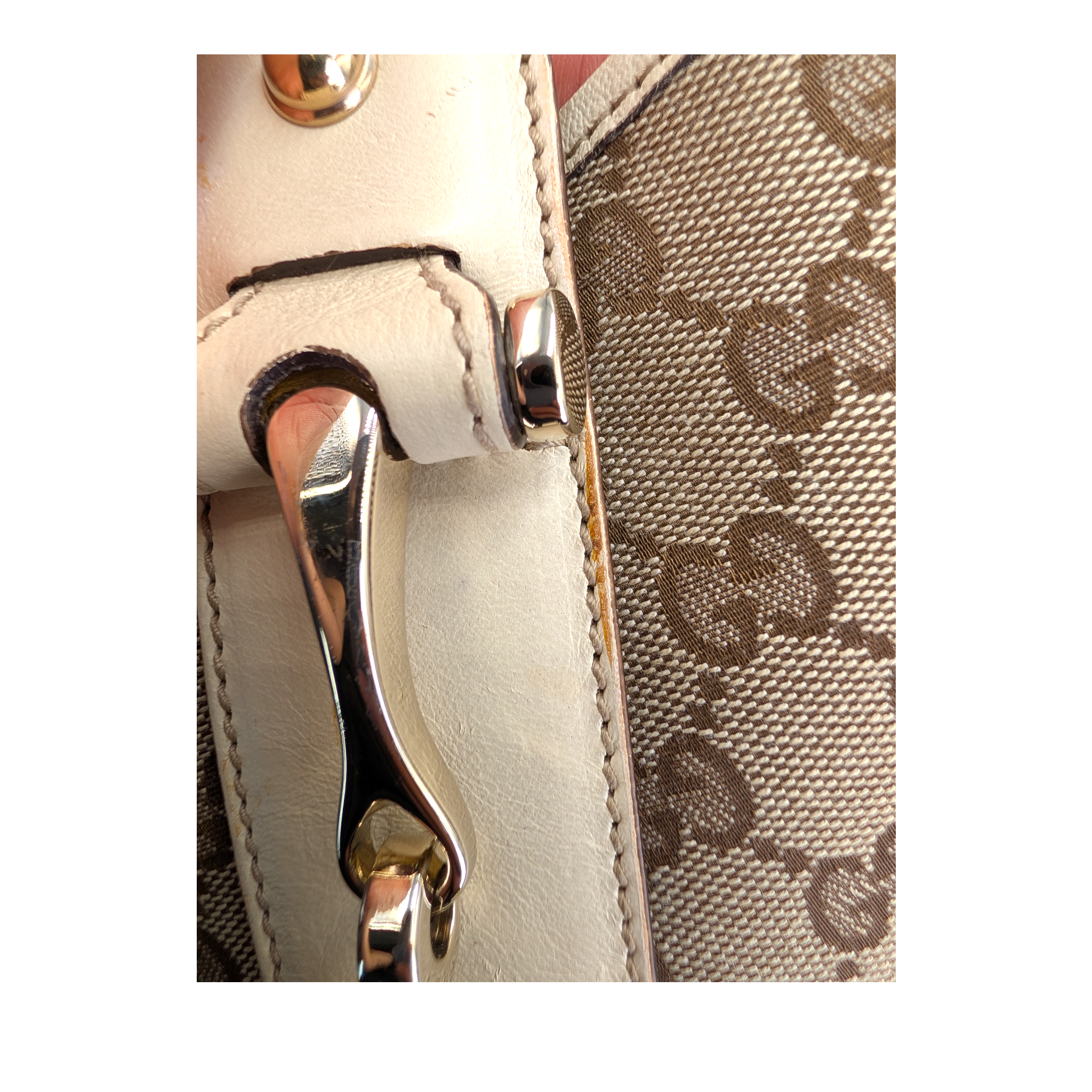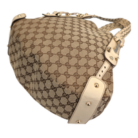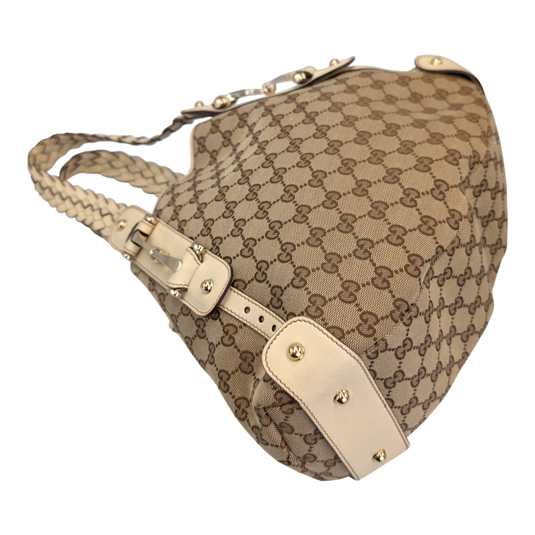 Die Gucci Pelham Tote ist ein klassisches Alltagsmodell aus dem ikonischen GG Canvas, kombiniert mit hellen Lederdetails und den charakteristischen geflochtenen Tragegriffen. Die weiche, leicht gerundete Form verleiht der Tasche eine feminine Silhouette, während die Hardware elegante Akzente setzt.