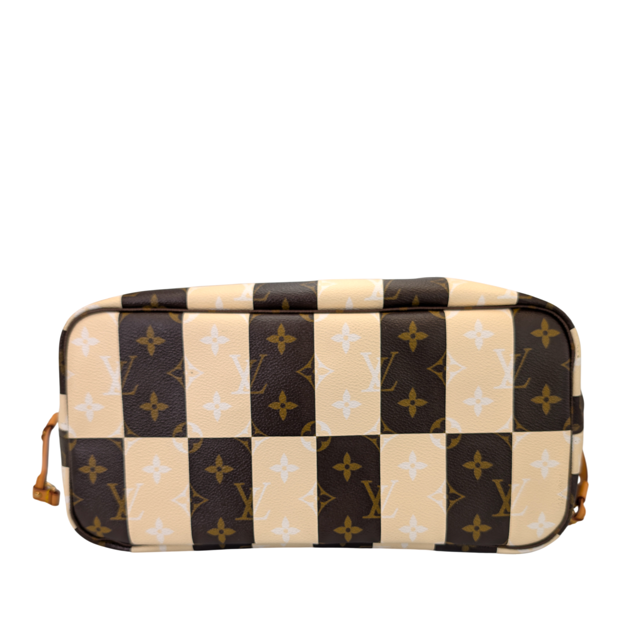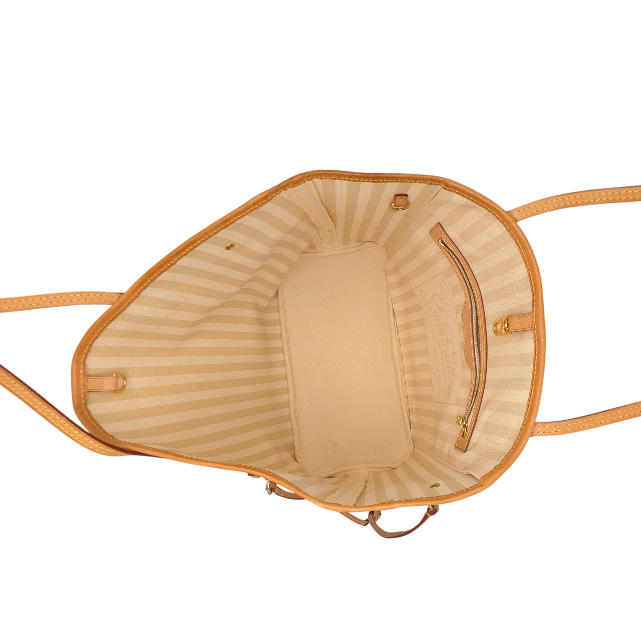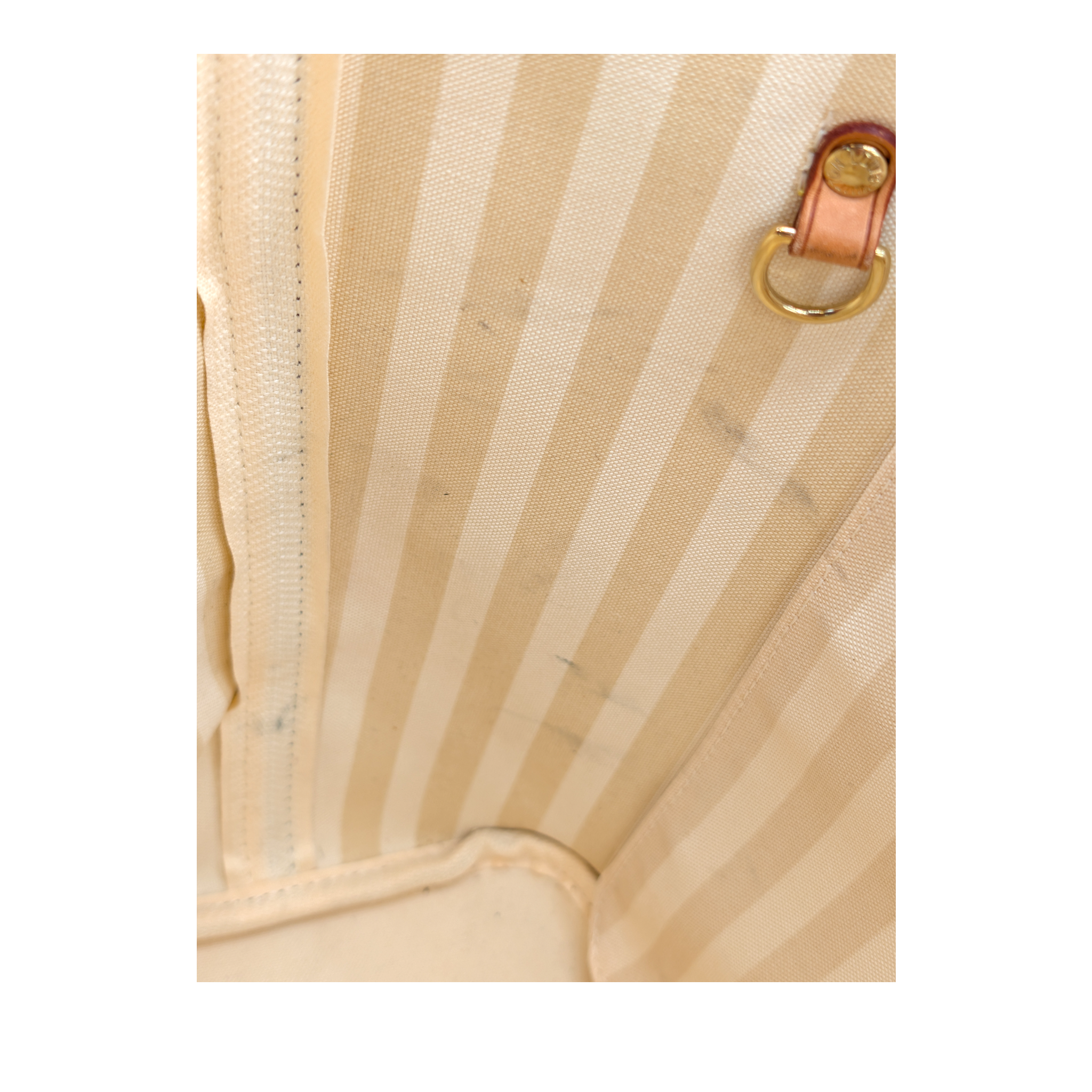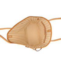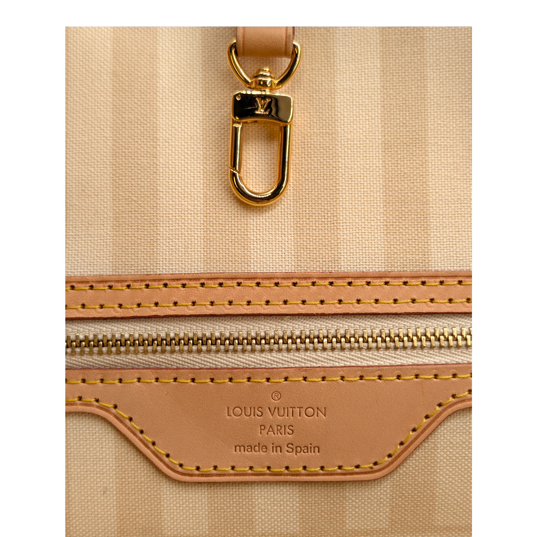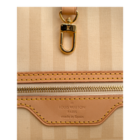 Die Louis Vuitton Neverfull MM Rayures ist eine seltenere und besonders sommerliche Interpretation des ikonischen Klassikers. Das charakteristische Monogram Canvas wird hier durch vertikale Streifen in Beige und Braun neu interpretiert – ein eleganter, frischer Look mit hohem Wiedererkennungswert.