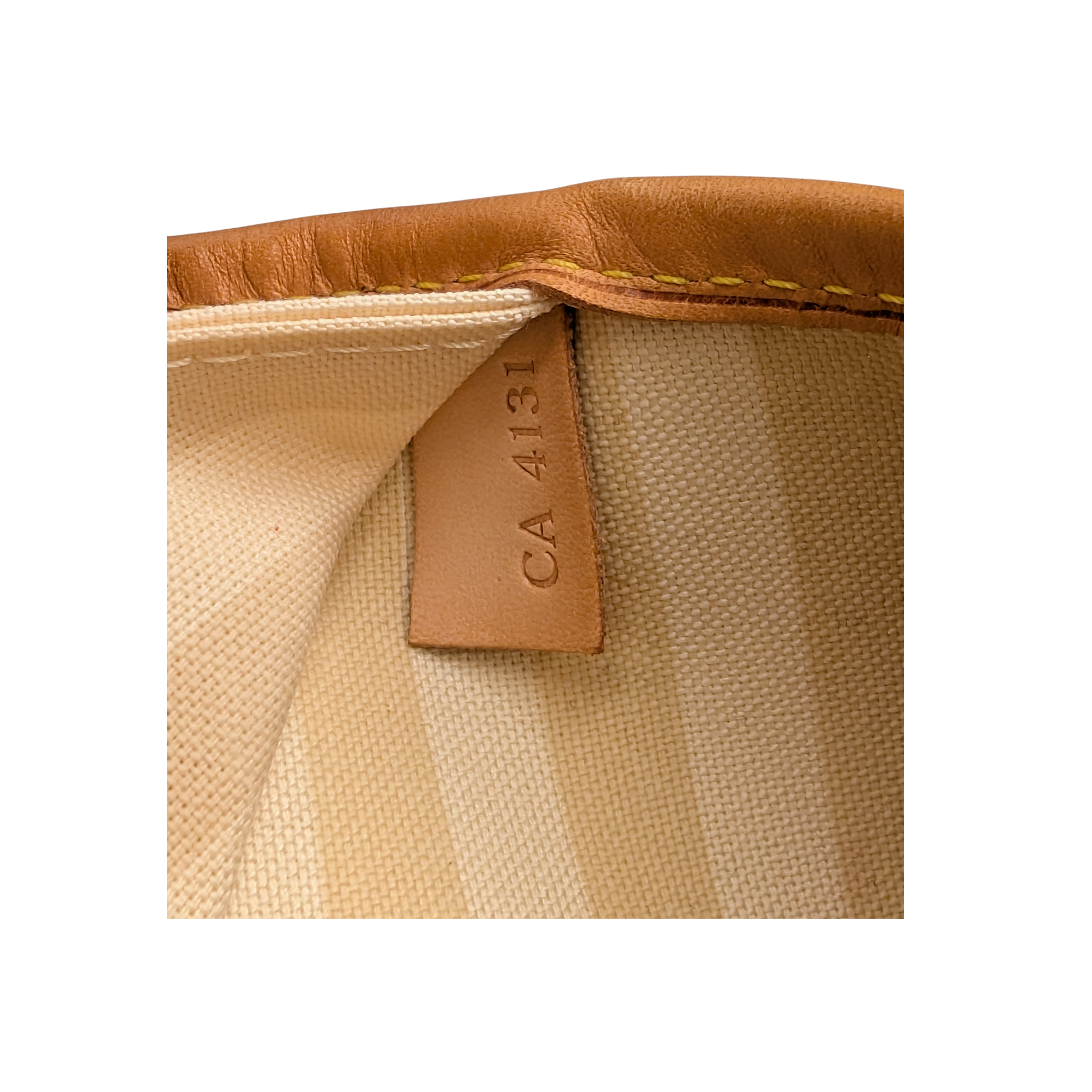 Die Kombination aus dem klassischen Monogram und den hellen Kontraststreifen verleiht der Tasche eine besondere Leichtigkeit und macht sie zu einem Statement-Piece, das dennoch zeitlos bleibt. Goldfarbene Hardware und das natürliche Vachetta-Leder runden das Design harmonisch ab.