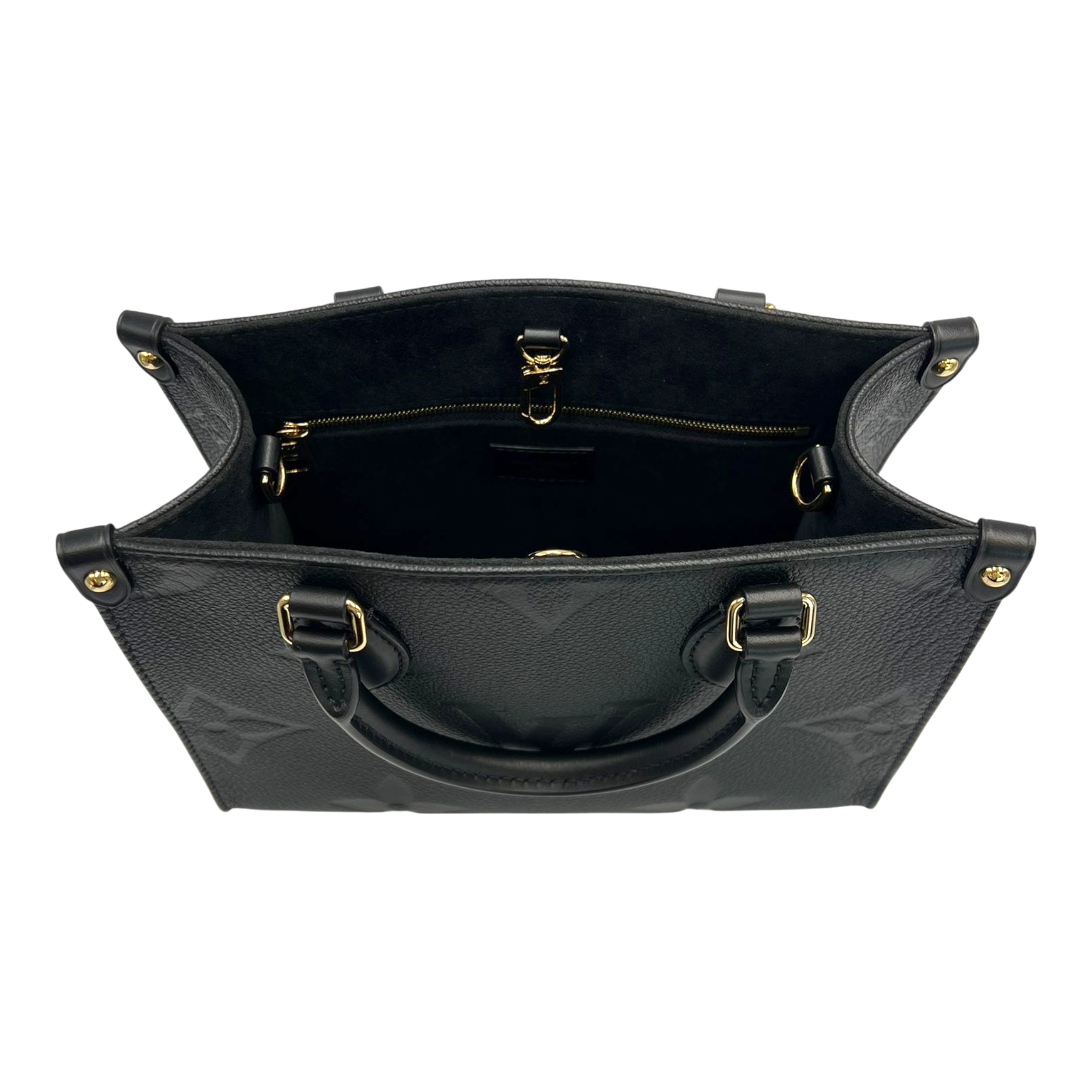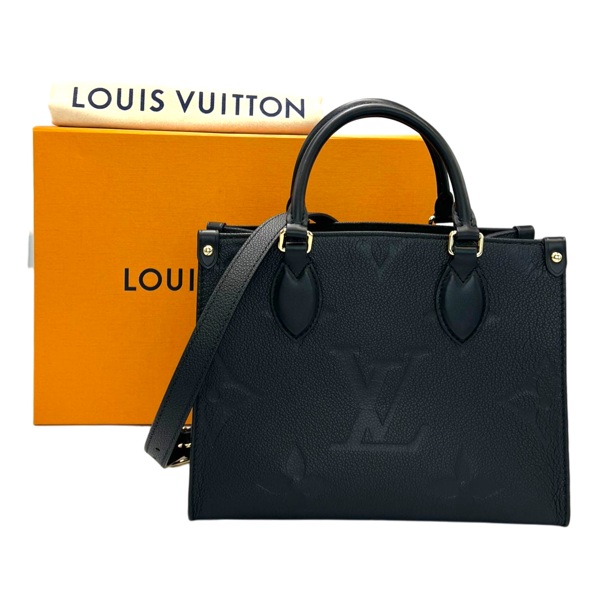 Die Louis Vuitton OnTheGo PM aus schwarzem Monogram Empreinte Leder vereint eine klare, moderne Linienführung mit der ikonischen Handschrift des Hauses. Das fein genarbte, geprägte Leder verleiht der Tasche eine elegante Tiefe, während die strukturierten Henkel und die goldfarbene Hardware einen zeitlosen, luxuriösen Akzent setzen. Die kompakte PM-Groesse macht sie zum perfekten Begleiter fuer den Alltag ebenso wie fuer elegante Anlaesse.