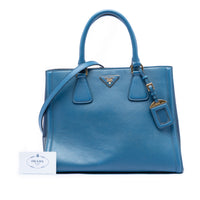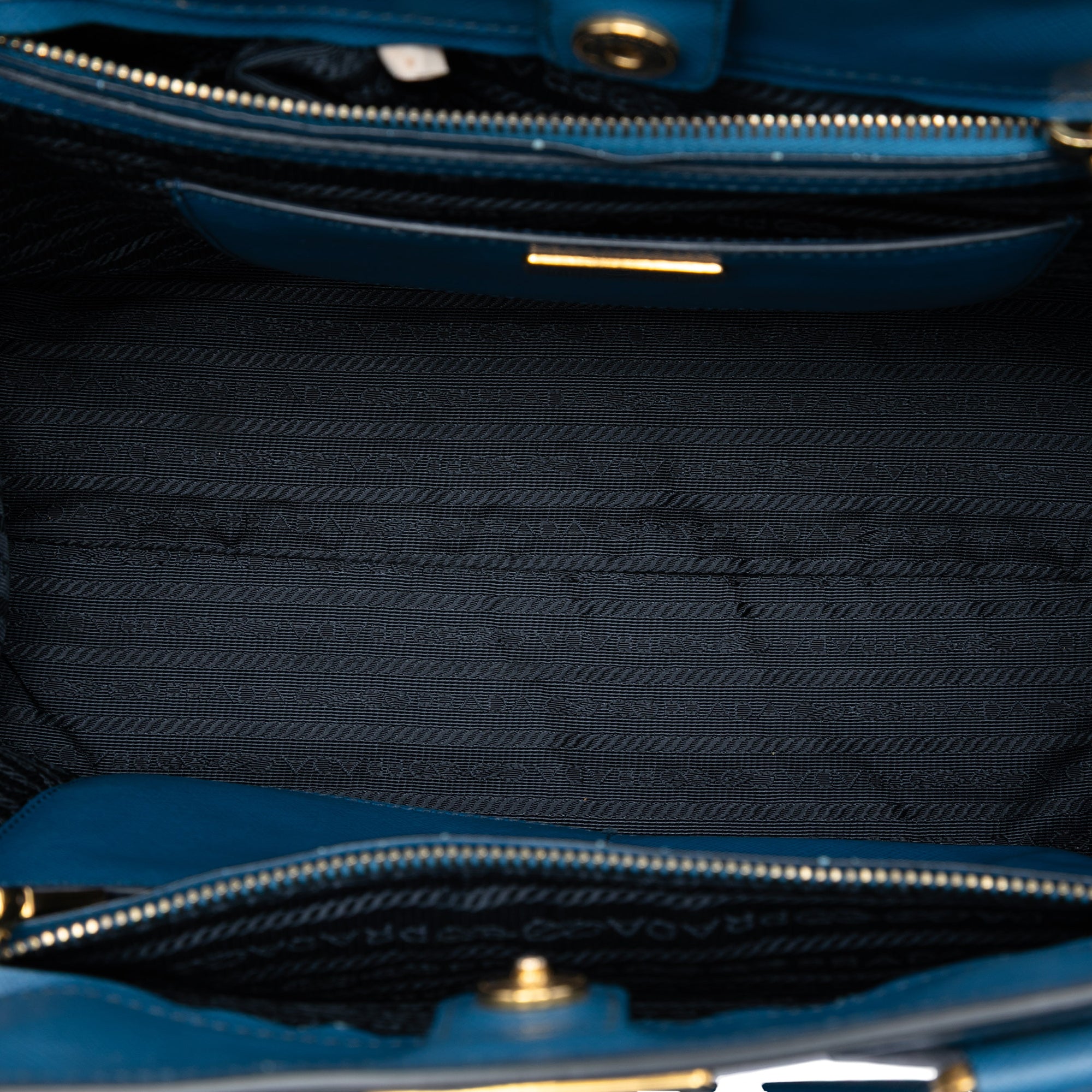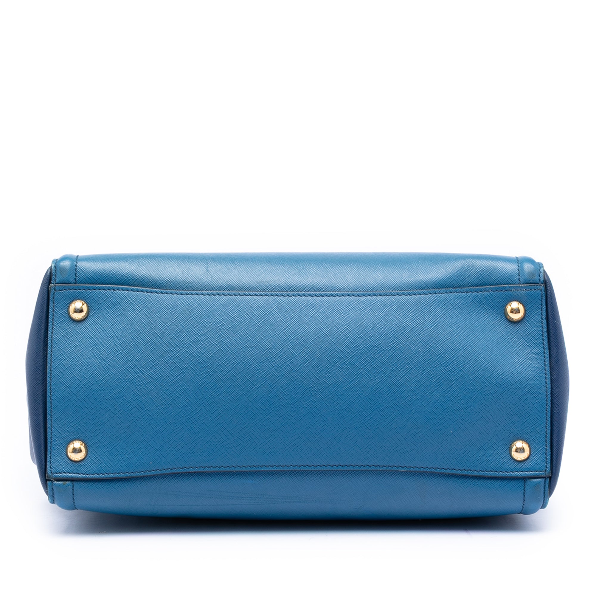 Die Prada Bicolor Saffiano Lux Galleria Satchel steht für klare Linien und eine architektonische Formensprache, die den Klassiker der Maison prägt. Der strukturierte Korpus aus Saffiano-Leder mit zweifarbiger Ausführung zeigt eine feine Kreuzprägung und eine elegante, leicht glänzende Oberfläche. Gerollte Lederhenkel betonen die ikonische Silhouette, während dezente Metallakzente den Look präzise abrunden.