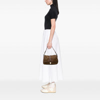 Die Prada Leather and Tessuto Shoulder Bag verbindet das charakteristische Tessuto-Nylon mit eleganten Lederbesätzen zu einer klaren, funktionalen Silhouette. Der flache Leder-Schulterriemen sorgt für einen ruhigen, komfortablen Sitz, während die Frontklappe mit Durchsteckverschluss dem Design Struktur und eine dezente Signatur verleiht. Die Kombination aus technischem Textil und glattem Leder unterstreicht Pradas präzise Linienführung und den sachlichen Luxus der Marke.