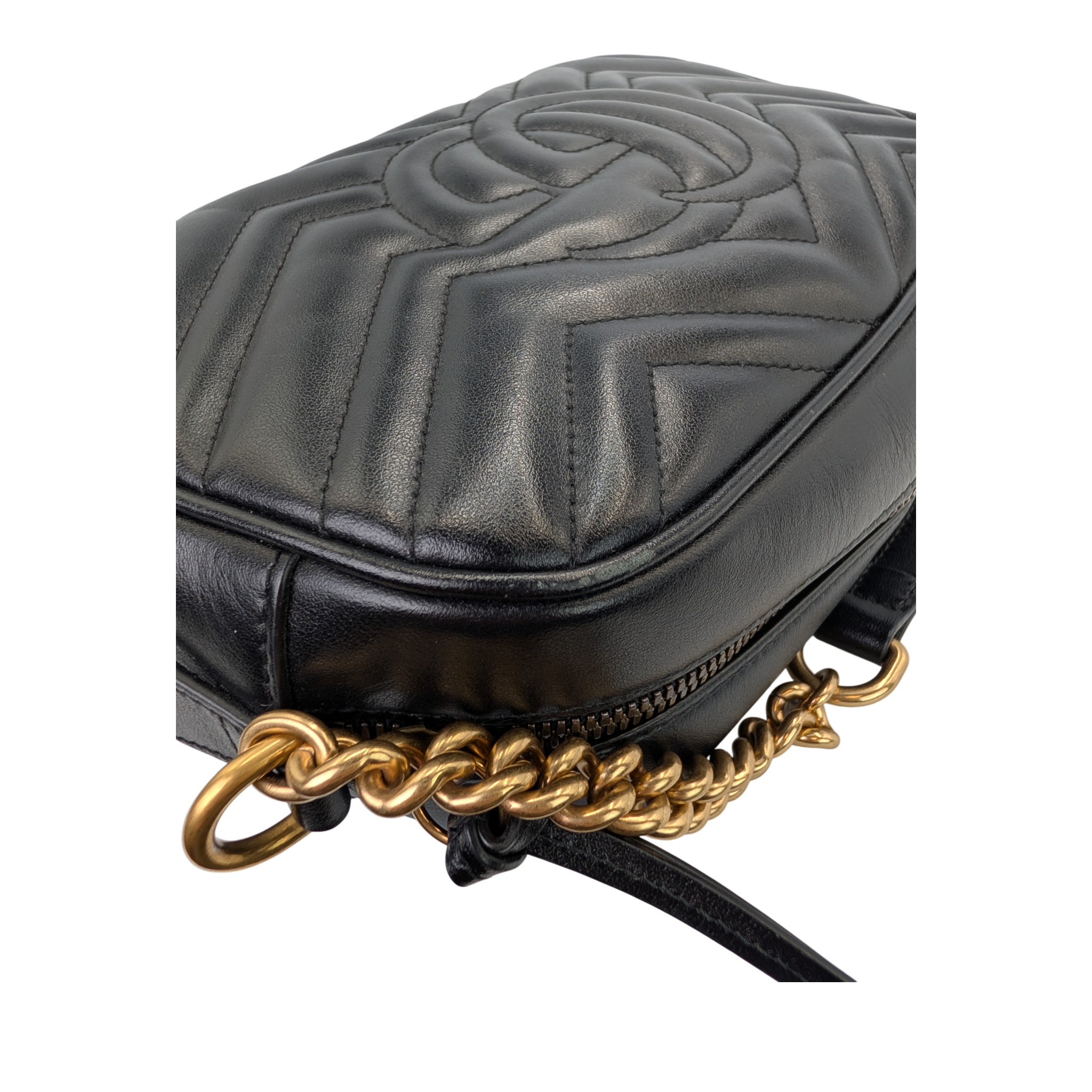 Die Gucci GG Marmont Camera Mini Bag aus schwarzem Leder ist ein moderner Klassiker mit ikonischem Wiedererkennungswert. Das charakteristische Chevron-Steppmuster verleiht der Tasche Struktur und Tiefe, während das markante Doppel-G Logo in goldfarbener Hardware einen eleganten Akzent setzt. Die kompakte Silhouette unterstreicht den zeitlosen, femininen Stil dieses Modells.