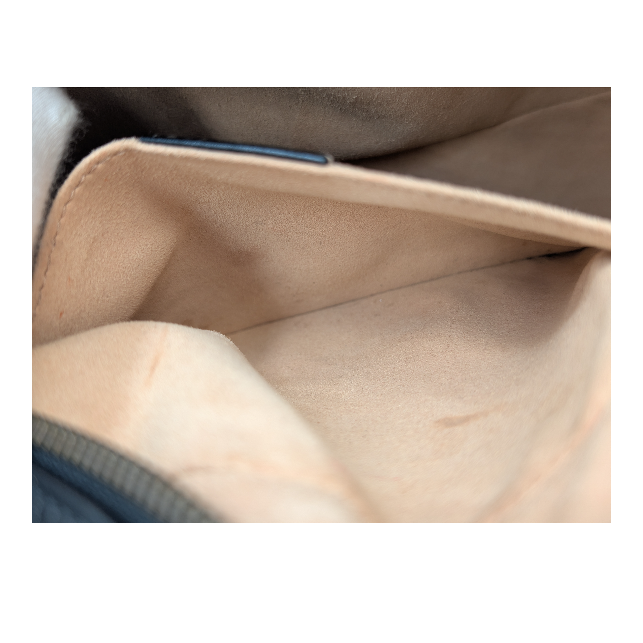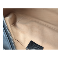 Zustand: Leder in sehr gutem Gesamtzustand mit leichten Gebrauchsspuren. An den hinteren Kanten dezente Abriebspuren sichtbar. Die goldfarbene Hardware weist minimale Kratzer sowie leichte Verfärbungen auf. Innen kleinere Flecken auf der Seitentasche erkennbar.