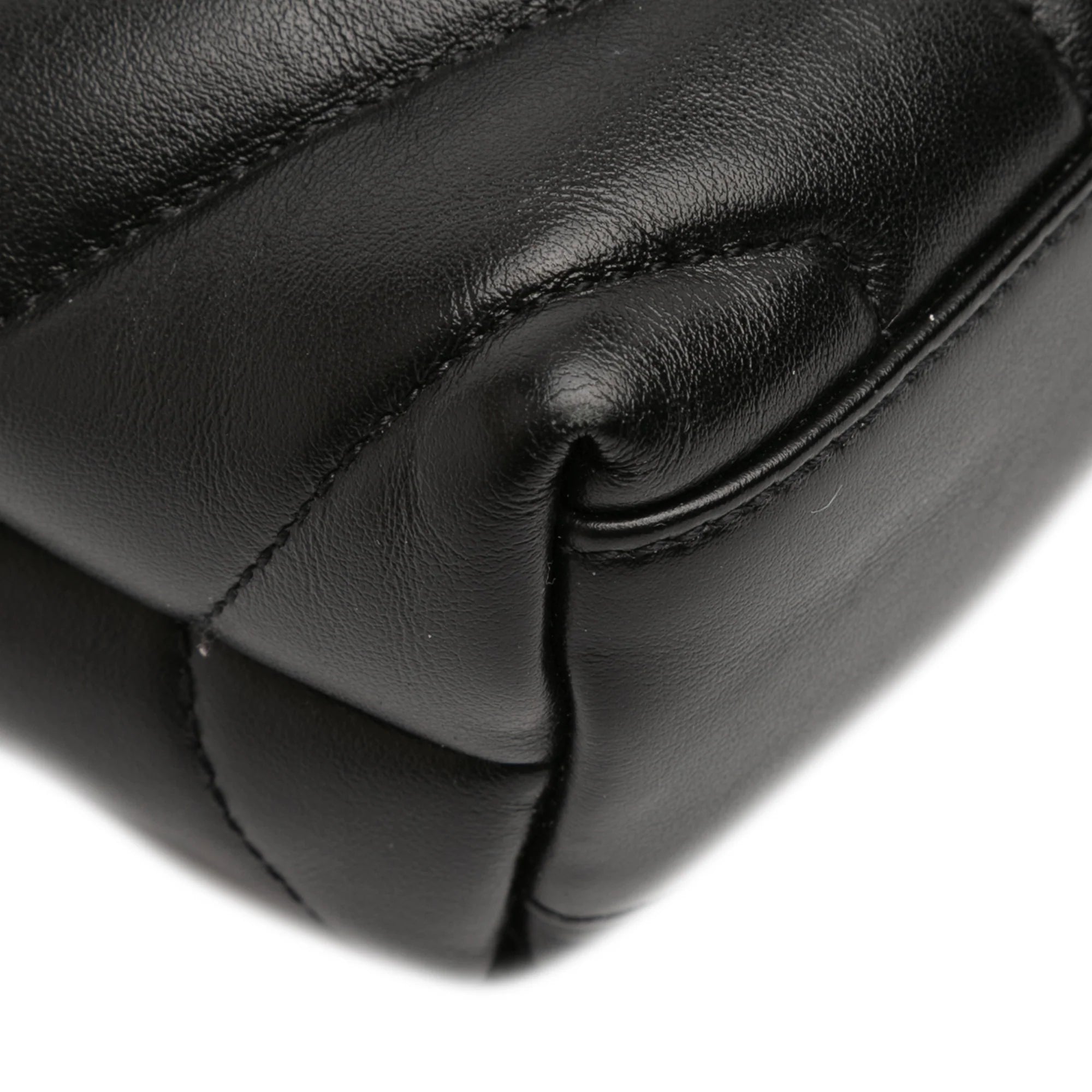Besonders auffällig ist das gepolsterte, gesteppte Leder, das der Tasche Struktur und Volumen verleiht. Die kompakte Grösse macht sie zum perfekten Begleiter – elegant am Tag, stilvoll am Abend.