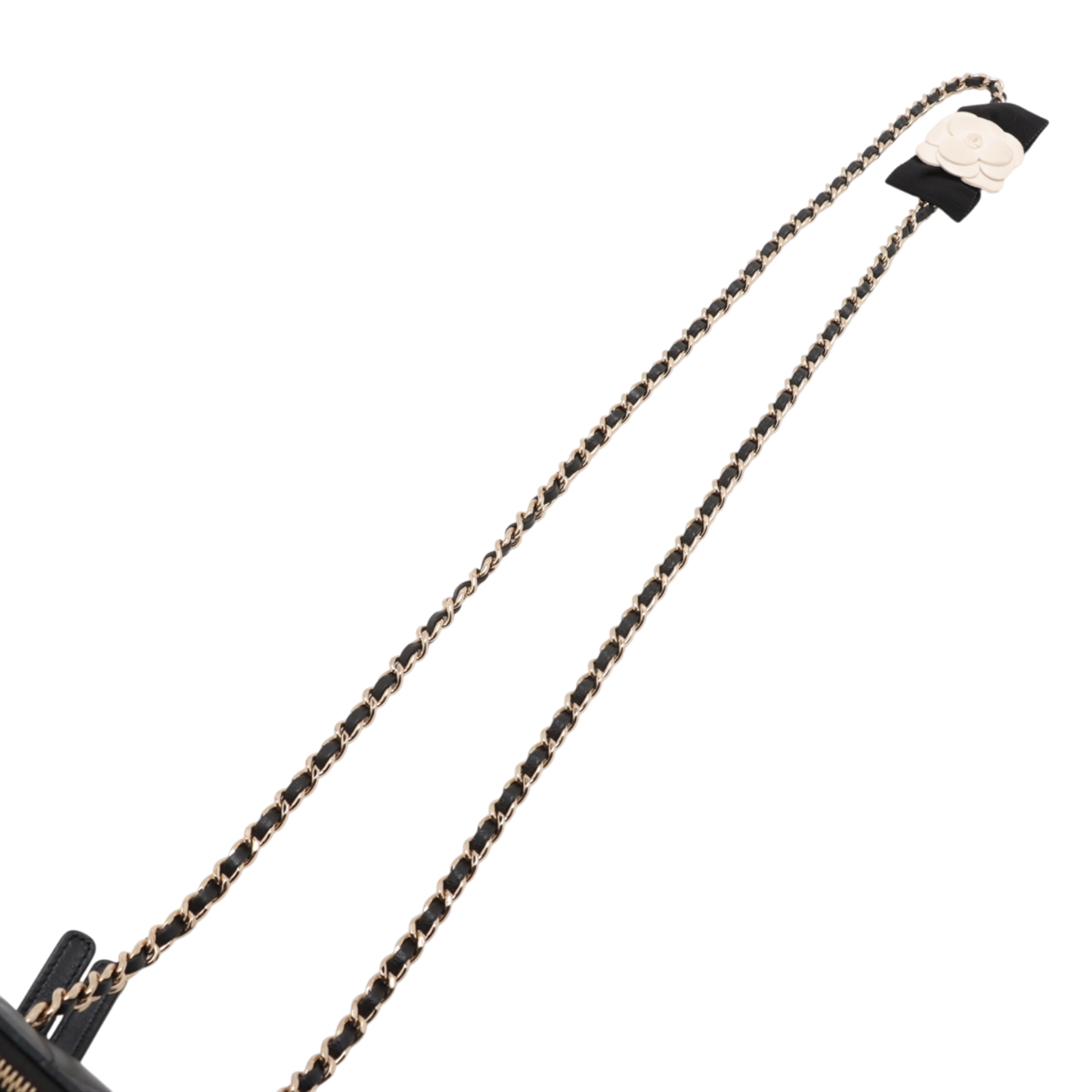 Diese Chanel Mini Vanity Bag ist ein echtes Herzensstück und ein absoluter Blickfang für die Festtage. Gefertigt aus feinem schwarzem Lambskin mit klassischer Rautensteppung und goldfarbener Hardware, vereint sie zeitlose Chanel-Eleganz mit einem verspielten, luxuriösen Twist. Das ikonische Camélia-Detail verleiht der Tasche einen besonders charmanten und festlichen Charakter.