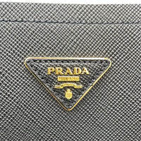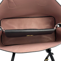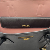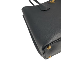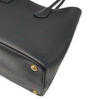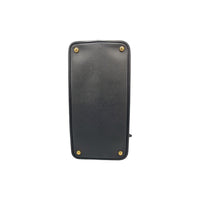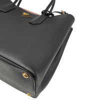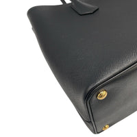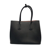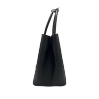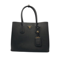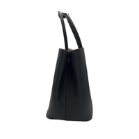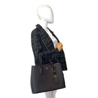 Die Double Cuir Tote wurde aus schwarzem Saffiano Leder hergestellt und verfügt über zwei gerollte Ledergriffe, einen abnehmbaren flachen Riemen, Innentaschen und eine offene Oberseite.