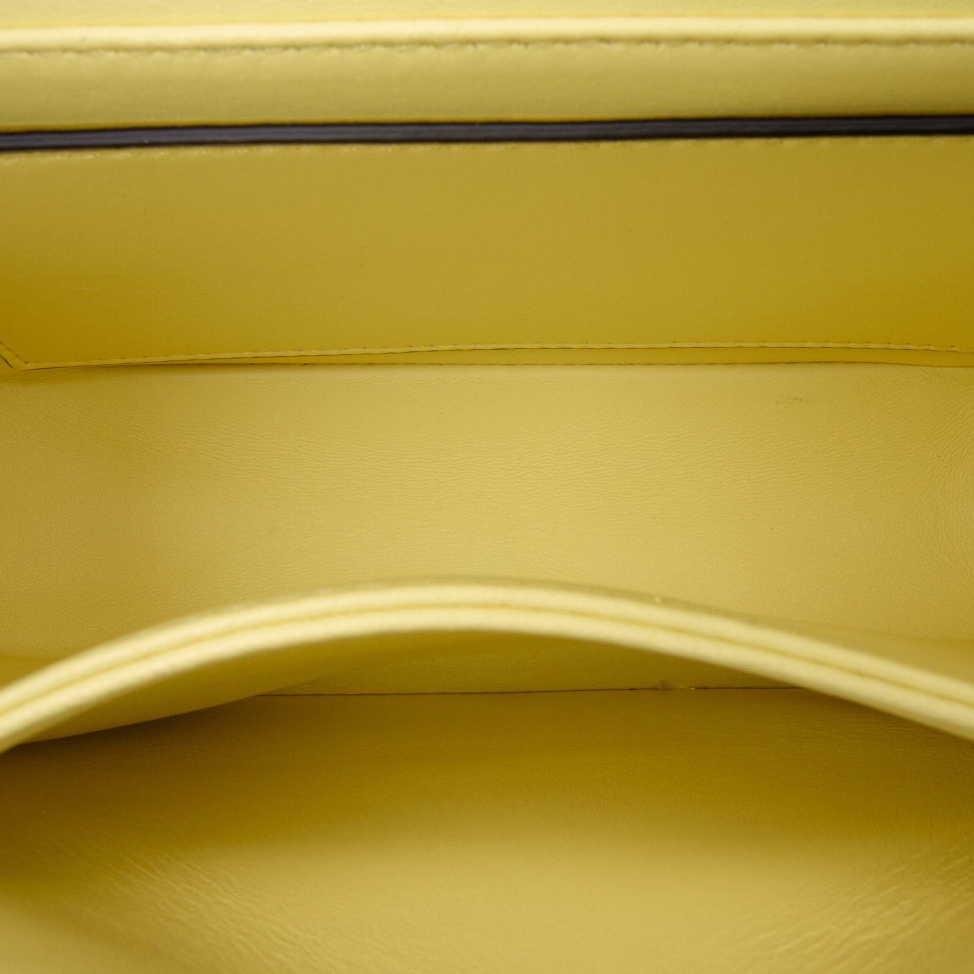 Gefertigt aus weichem Nappaleder in Gelb und ergänzt durch goldfarbene Hardware eignet sich dieses Modell ideal als stilvolles Statement-Piece für besondere Anlässe oder als Akzent im Alltag.