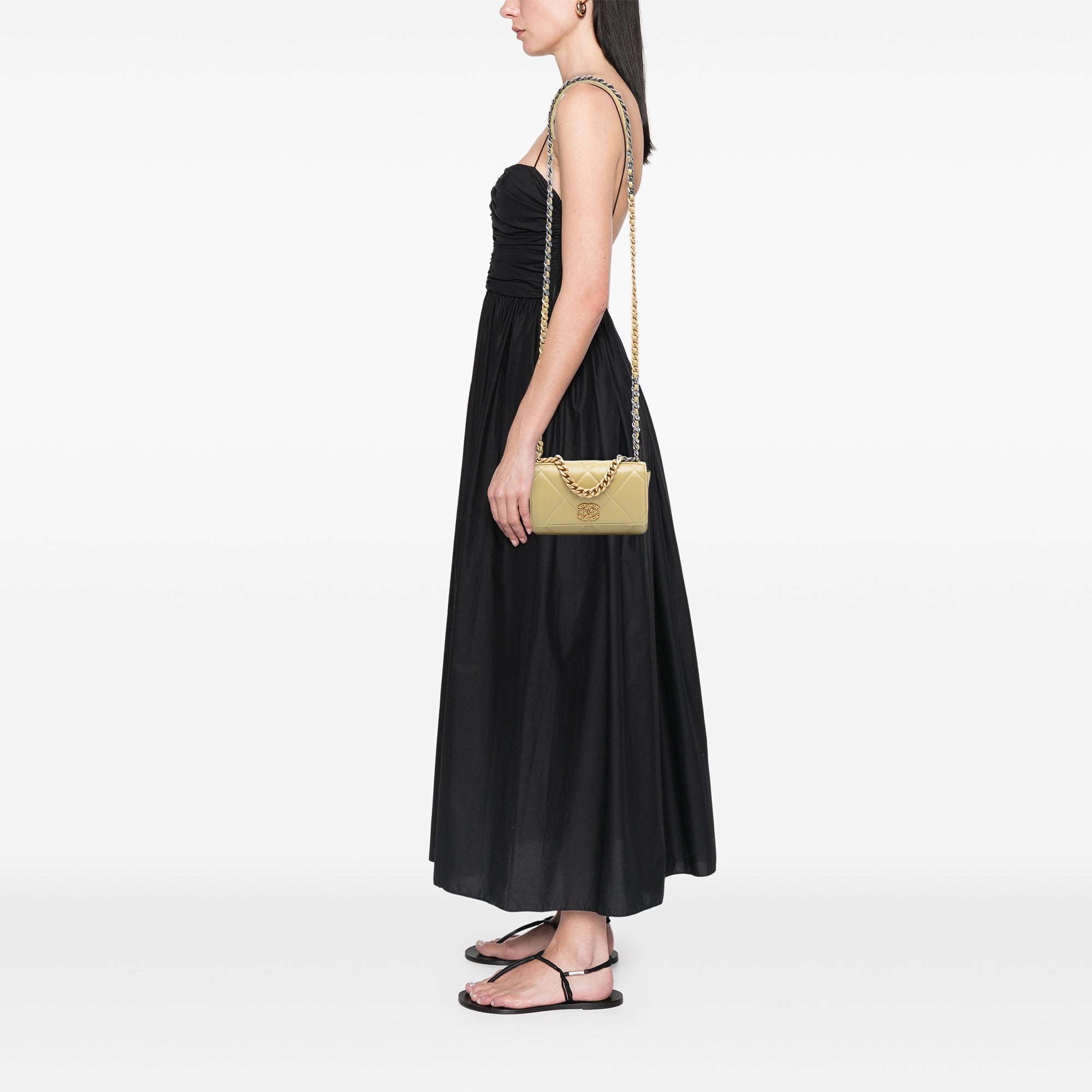 The Chanel 19 Wallet on Chain, crafted from quilted lambskin, combines the Maison’s iconic silhouette with a compact, everyday-friendly design. The soft leather is textured by the distinctive quilting, giving the bag an elegant yet modern look. A chain handle and a chain shoulder strap interwoven with leather and featuring a leather pad add the signature Chanel touch and allow for versatile carrying options.