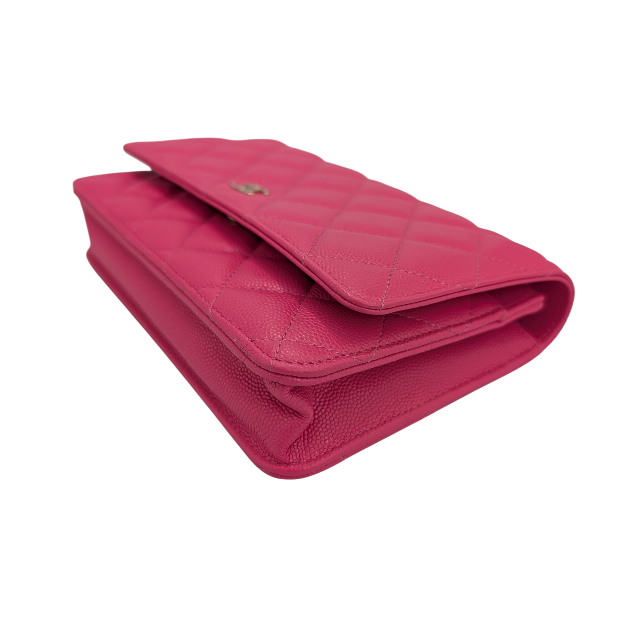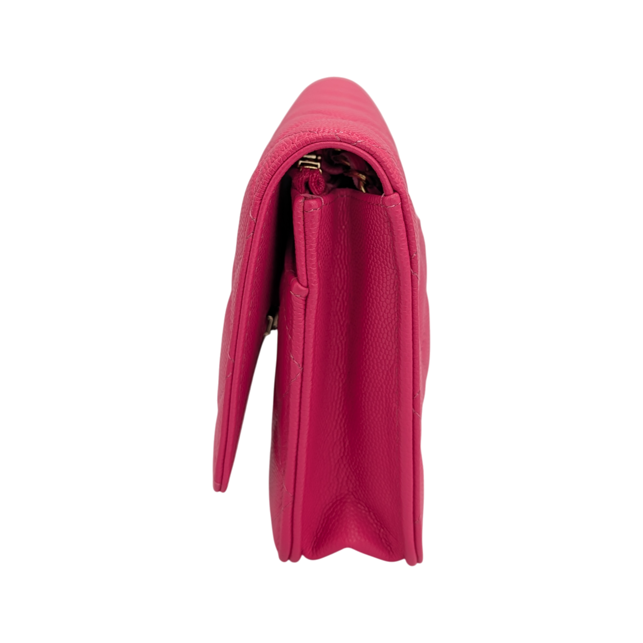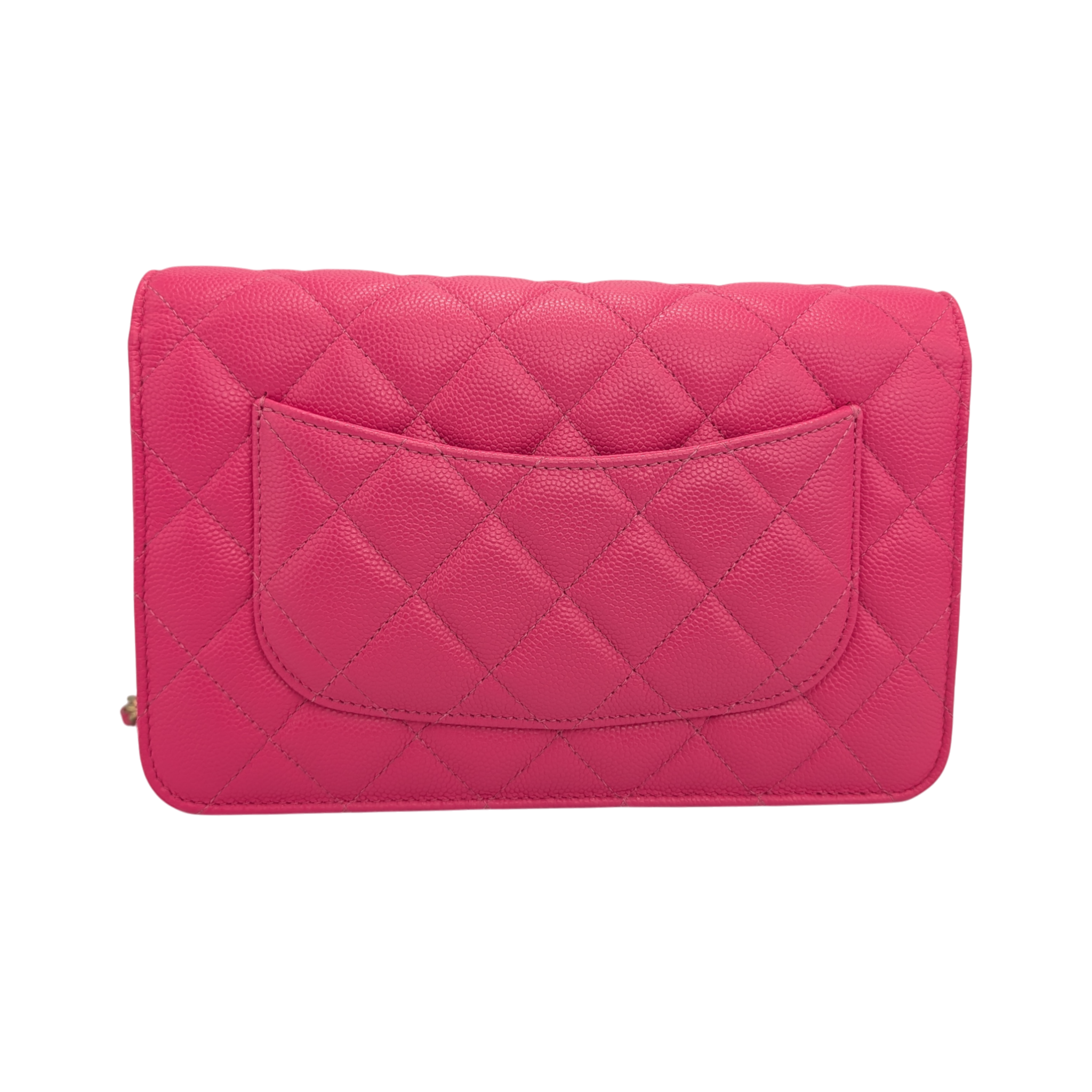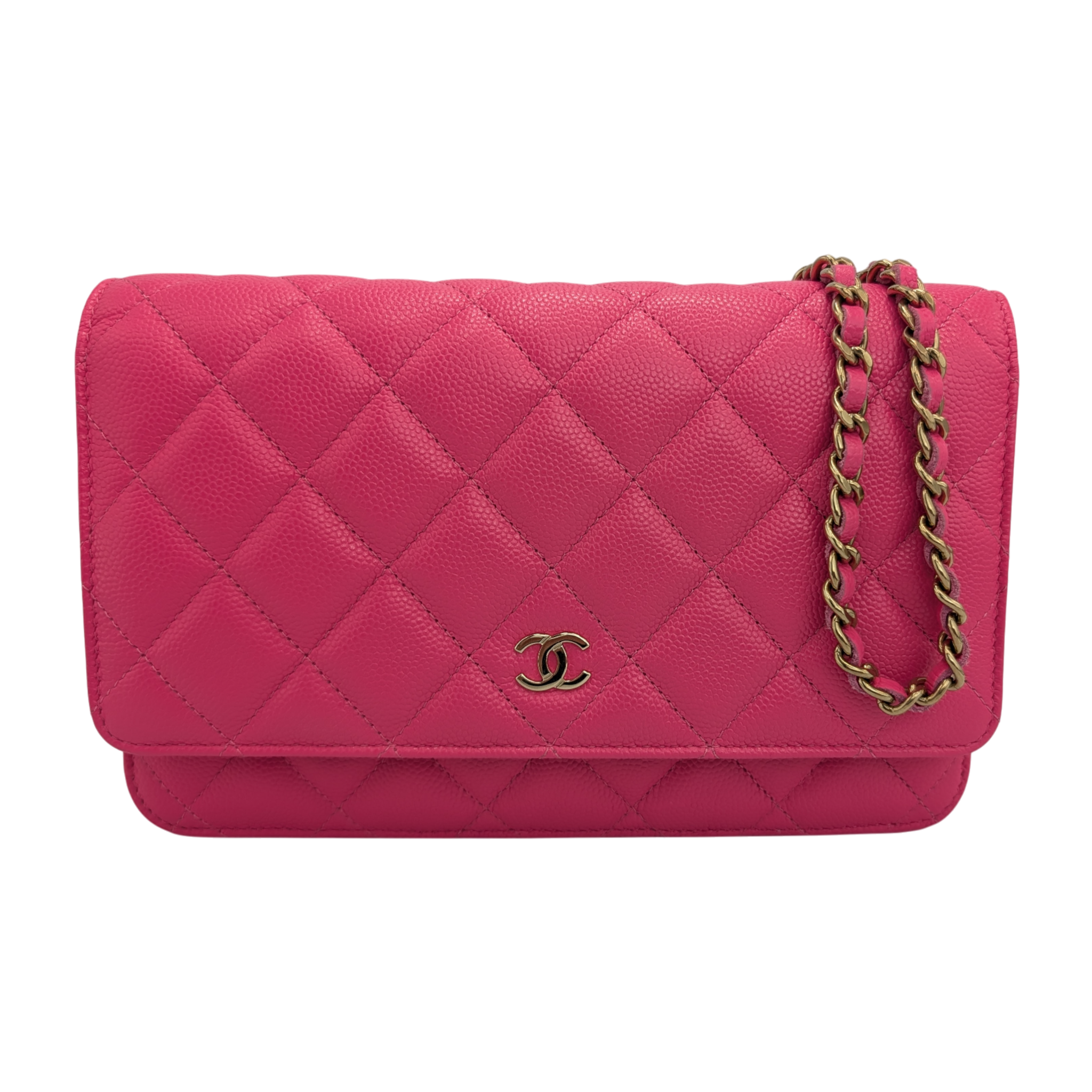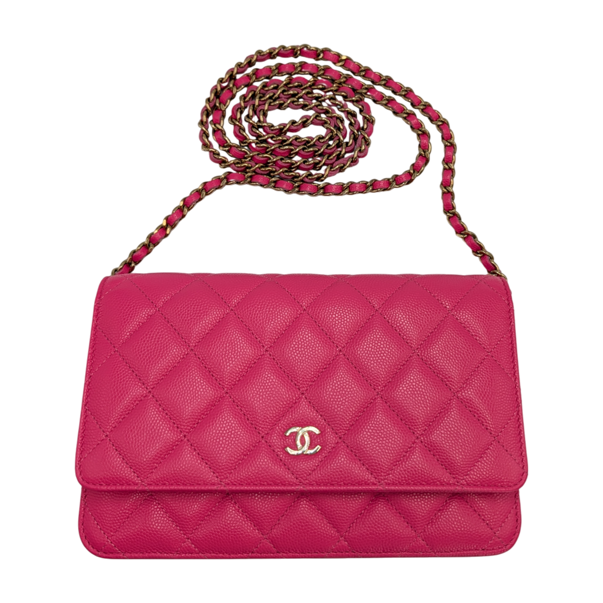 The Chanel Wallet on Chain (WOC) made of black Caviar-Leather with gold-tone hardware is a timeless classic from Chanel. The iconic diamond quilting pattern and the CC logo on the front give the Bag an elegant, immediately recognizable look. The fine chain strap with leather thread allows it to be worn over the shoulder or crossbody and makes the model versatile.