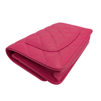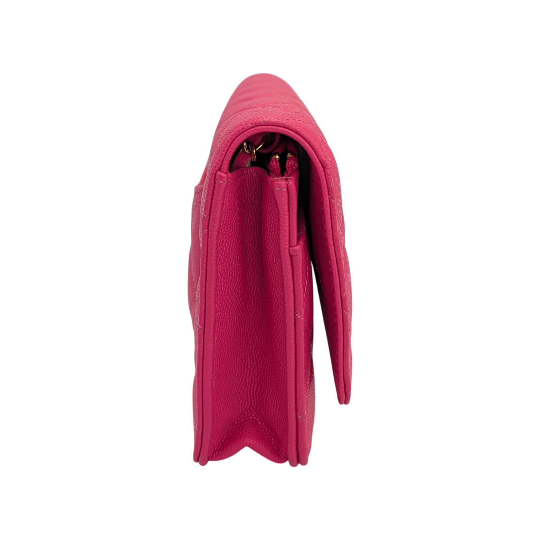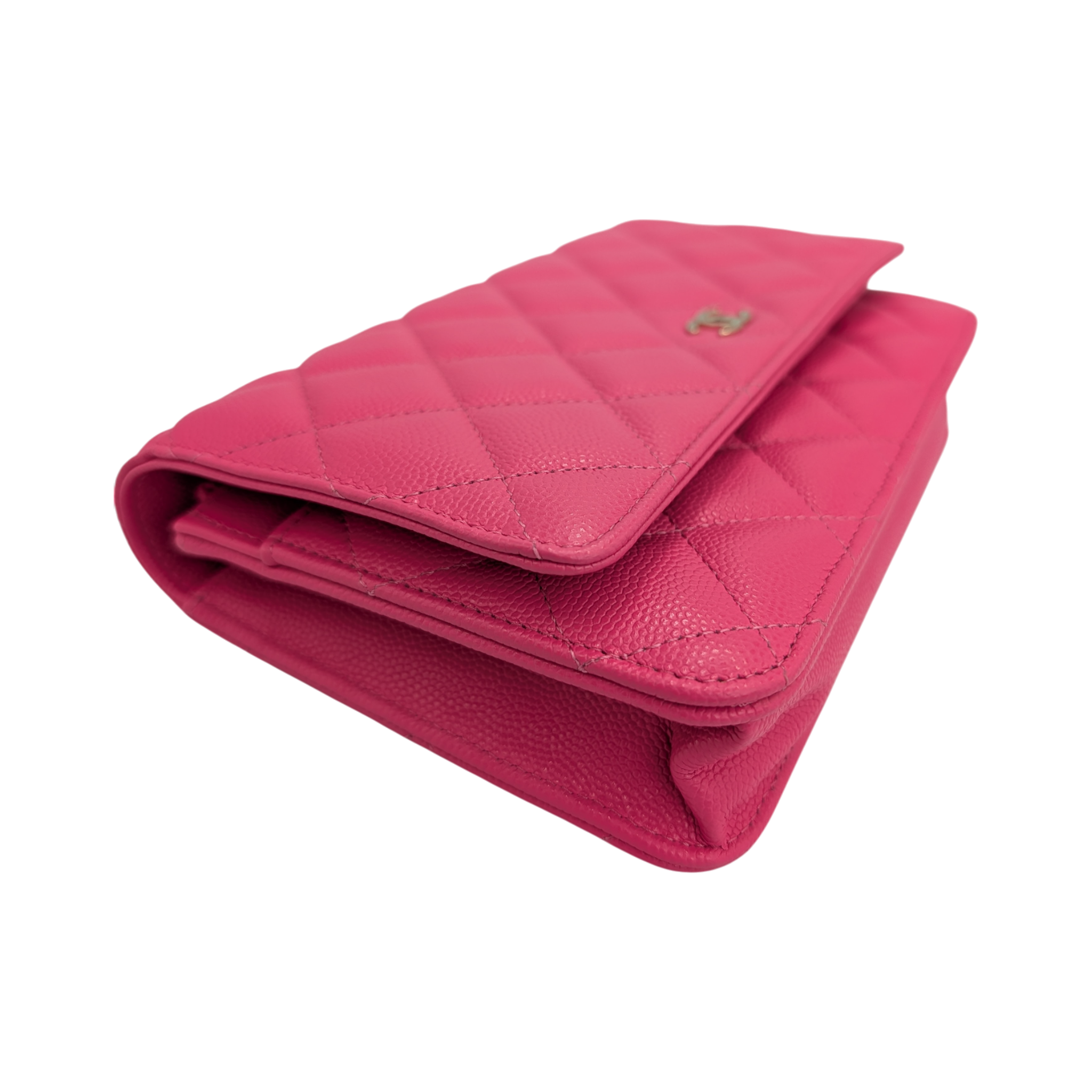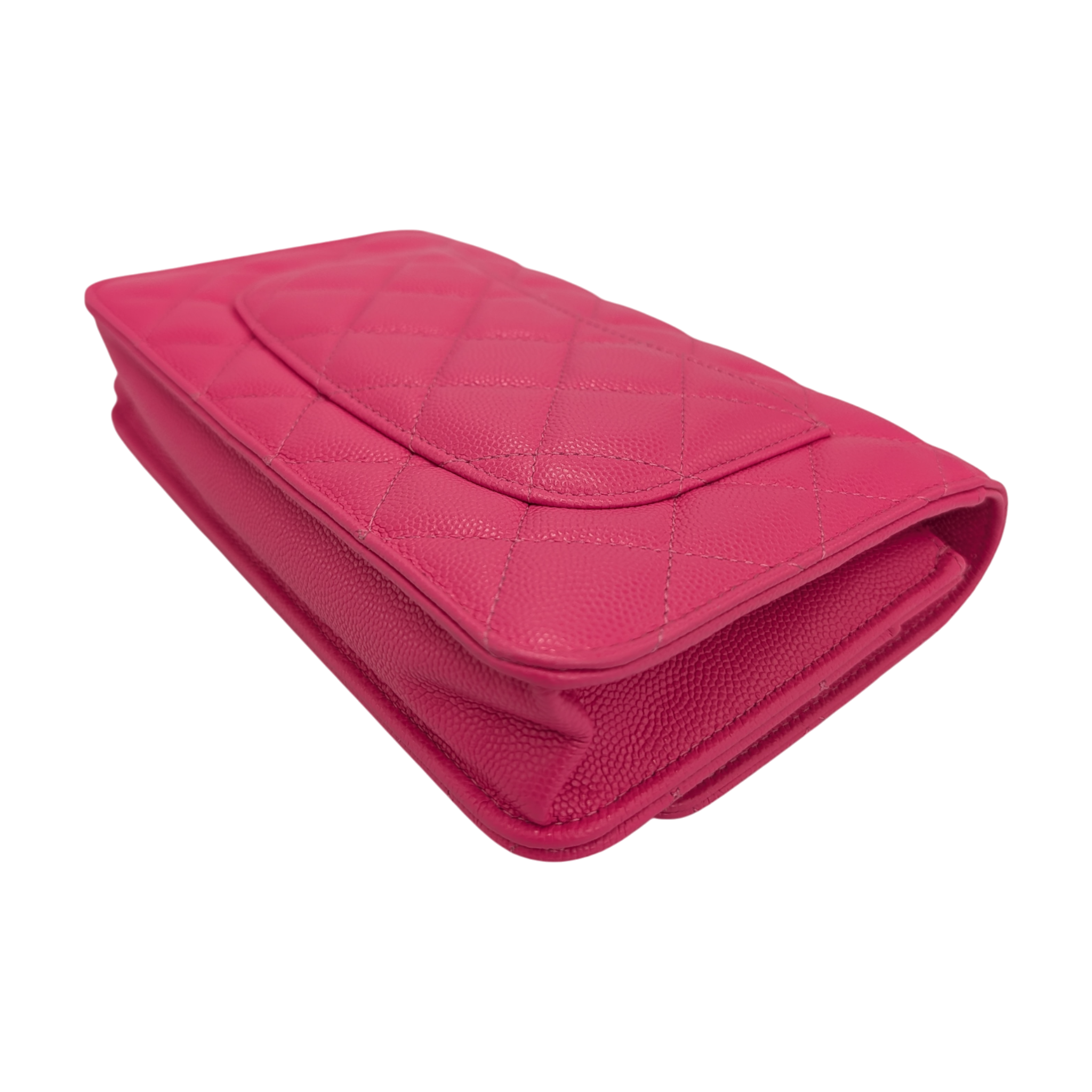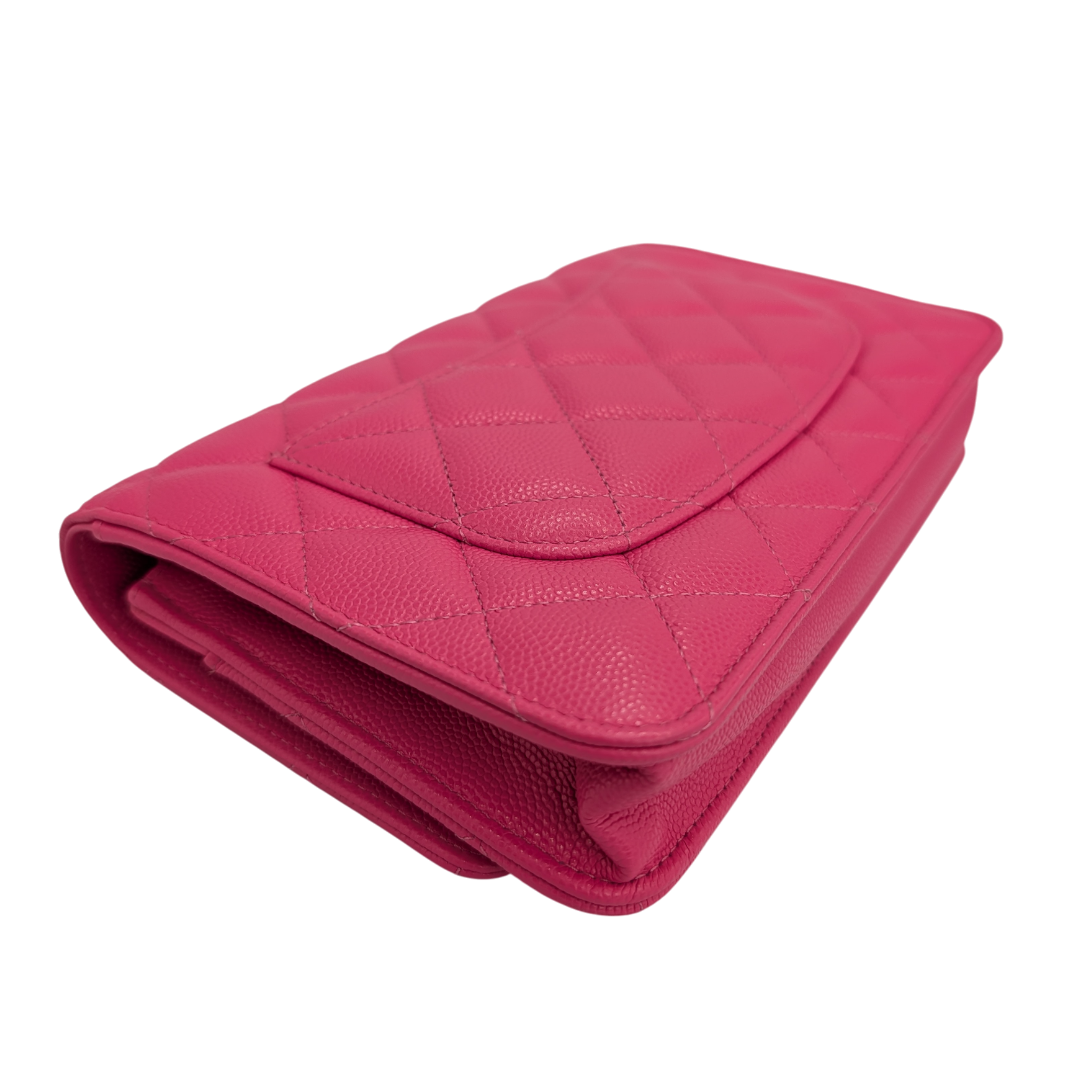 The Chanel Wallet on Chain (WOC) made of black Caviar-Leather with gold-tone hardware is a timeless classic from Chanel. The iconic diamond quilting pattern and the CC logo on the front give the Bag an elegant, immediately recognizable look. The fine chain strap with leather thread allows it to be worn over the shoulder or crossbody and makes the model versatile.