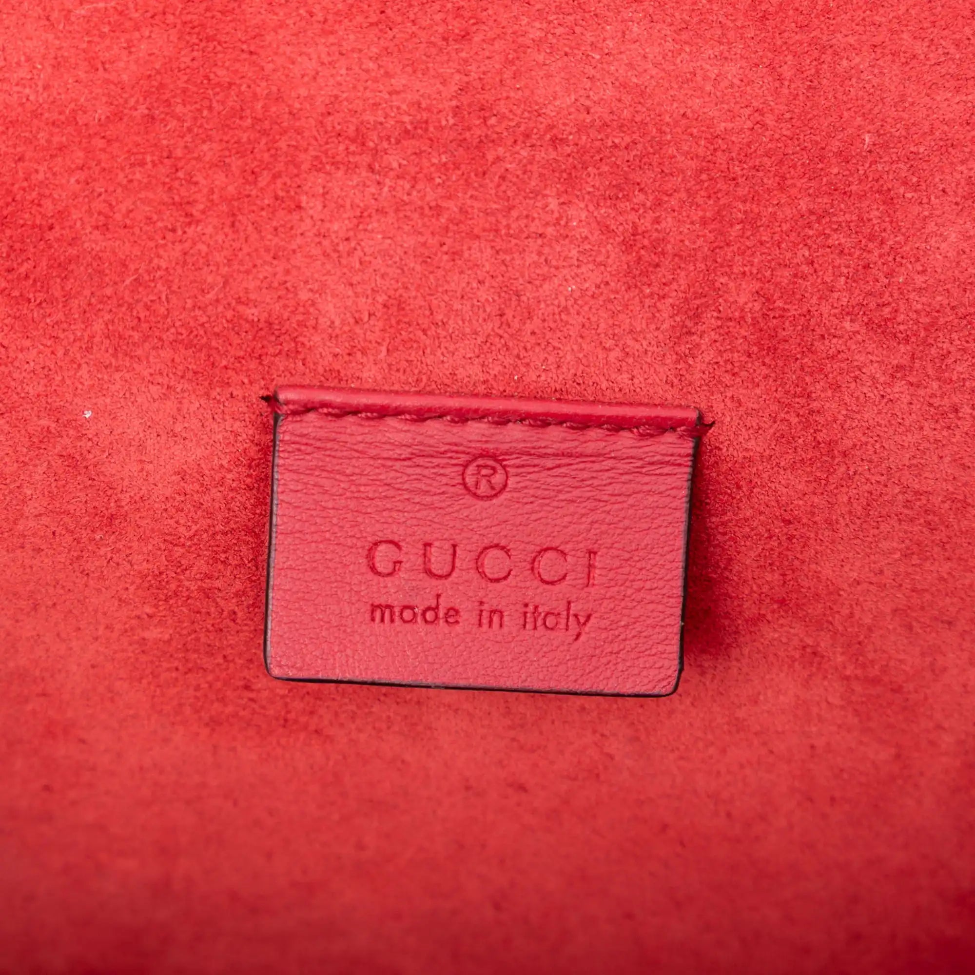 Dionysus, the Greek god of wine and joy, is the inspiration for the Gucci collection of the same name. The tiger head clasp on the flap refers to the legend according to which Dionysus is said to have crossed the Tigris on a tiger sent by Zeus. On the other hand, the horseshoe shape of the buckle creates a reference to equestrian sport, which is close to the Italian fashion house. This example in the voluminous medium version was made from light brown, coated GG canvas. The Bag has red suede trimmings on the sides, bottom and flap. The Bag is worn over the shoulder. It features a silver chain strap, a snap closure flap and a center zippered compartment. The silver chain strap can be worn double over the shoulder or simply crossbody.