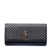 The Saint Laurent Leather Monogram Crystal Studded Cassandre Clutch reimagines the classic evening clutch with clean lines and the signature Cassandre monogram on the front. Crafted from leather, the clutch is accented with crystal-studded details that lend a precise, jewelry-like touch to its minimalist design. The flap with a magnetic closure ensures a sleek silhouette and a clean finish.