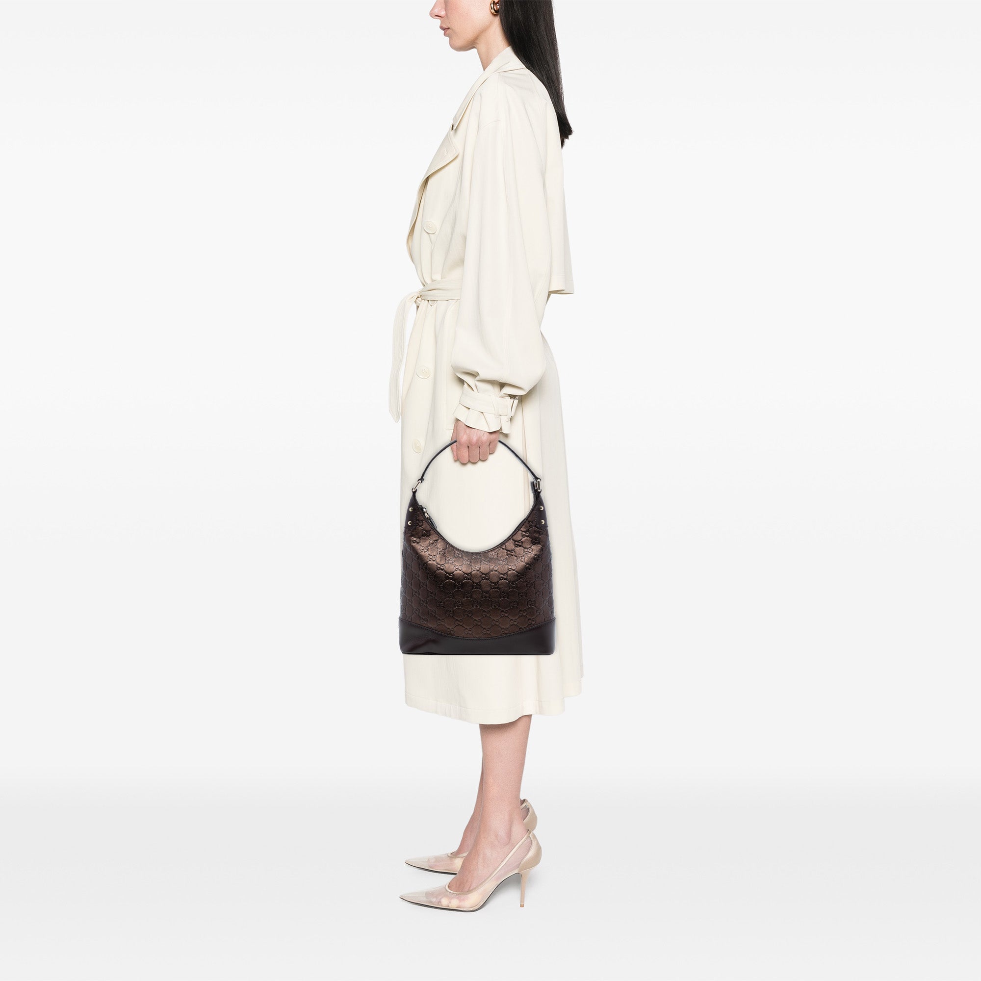 Le sac à bandoulière Gucci Metallic Guccissima réinterprète le monogramme classique de Gucci sous la forme d'un motif Guccissima gaufré sur un cuir aux reflets métalliques. Sa silhouette compacte affiche un style épuré et moderne, tandis que sa texture discrète confère au modèle de la profondeur et un aspect raffiné. La bandoulière plate en cuir assure des lignes élégantes et permet de porter le sac confortablement près du corps.