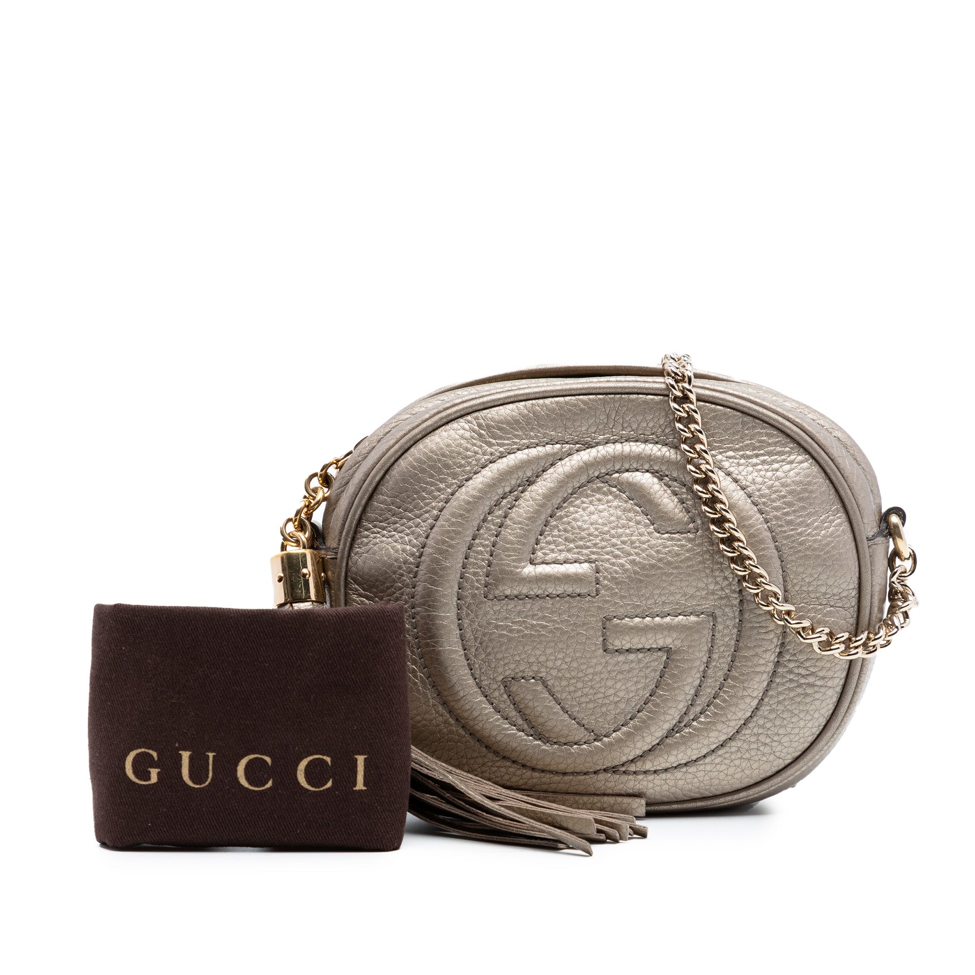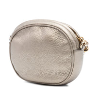 Le sac à bandoulière Gucci Mini Metallic Pebbled Calfskin Soho Chain allie une silhouette compacte à l'esthétique Soho caractéristique de la marque. Ce modèle est confectionné en cuir de veau grainé à la finition métallisée et arbore le monogramme GG en relief sur le devant. Un petit pompon sur la fermeture à glissière apporte une touche discrète, tandis que les lignes épurées soulignent le caractère élégant du modèle.