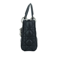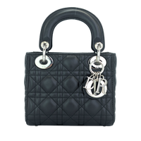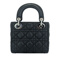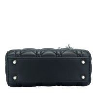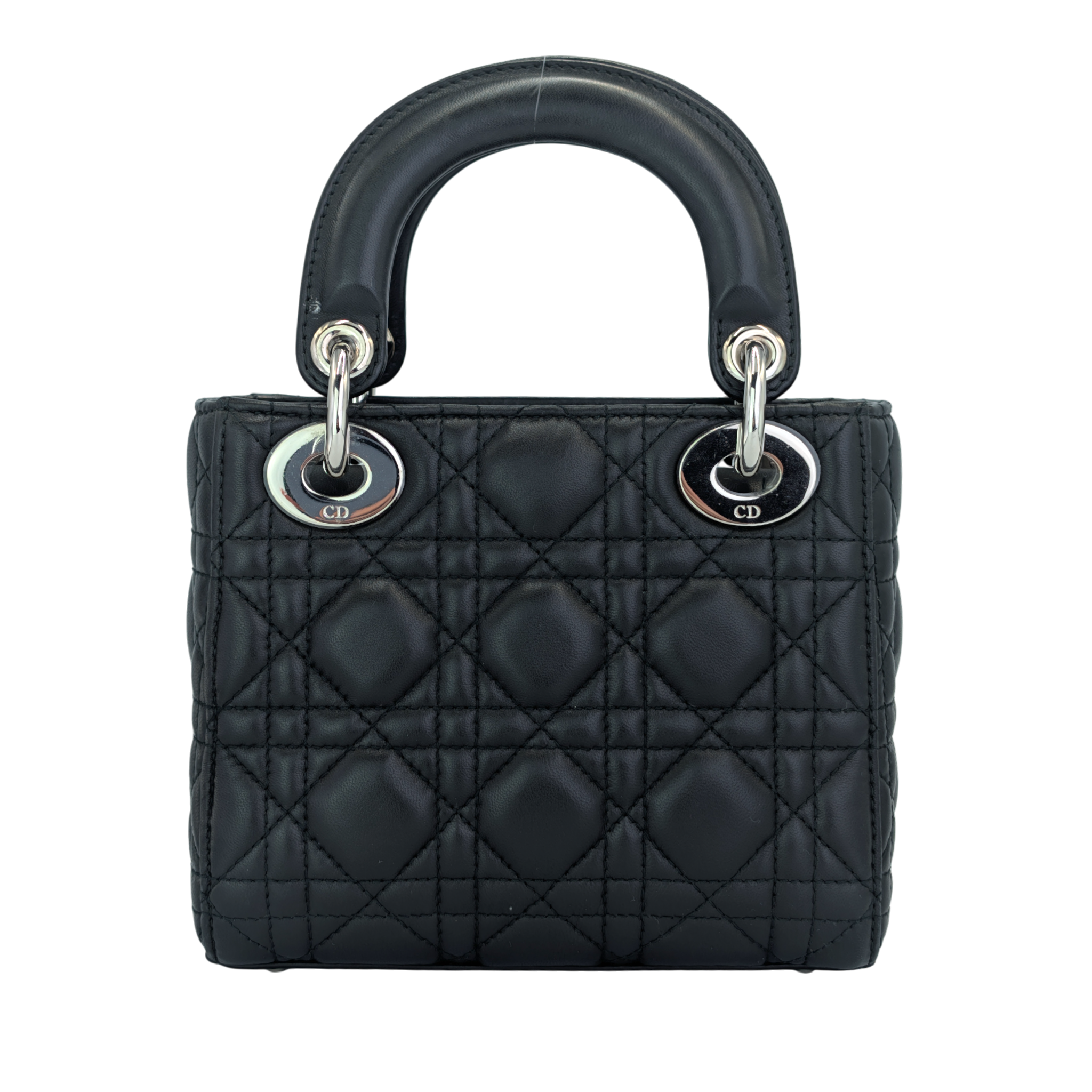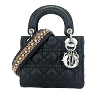 Une élégante Lady Dior Mini en cuir d'agneau noir et doux, un exemple de sophistication intemporelle. Le design classique est joliment complété par la bandoulière avec de fins rivets roses, argentés et dorés et donne au sac un accent moderne et ludique.