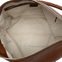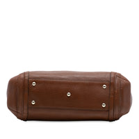 Ce bel exemple est fabriqué en cuir grainé marron et complété par des détails dorés. L'intérieur était équipé de toiles légères. À l'intérieur, il dispose d'un compartiment zippé et de poches plaquées. Le sac peut être porté à la main ou à l'épaule. Un sac élégant mais pratique au quotidien.