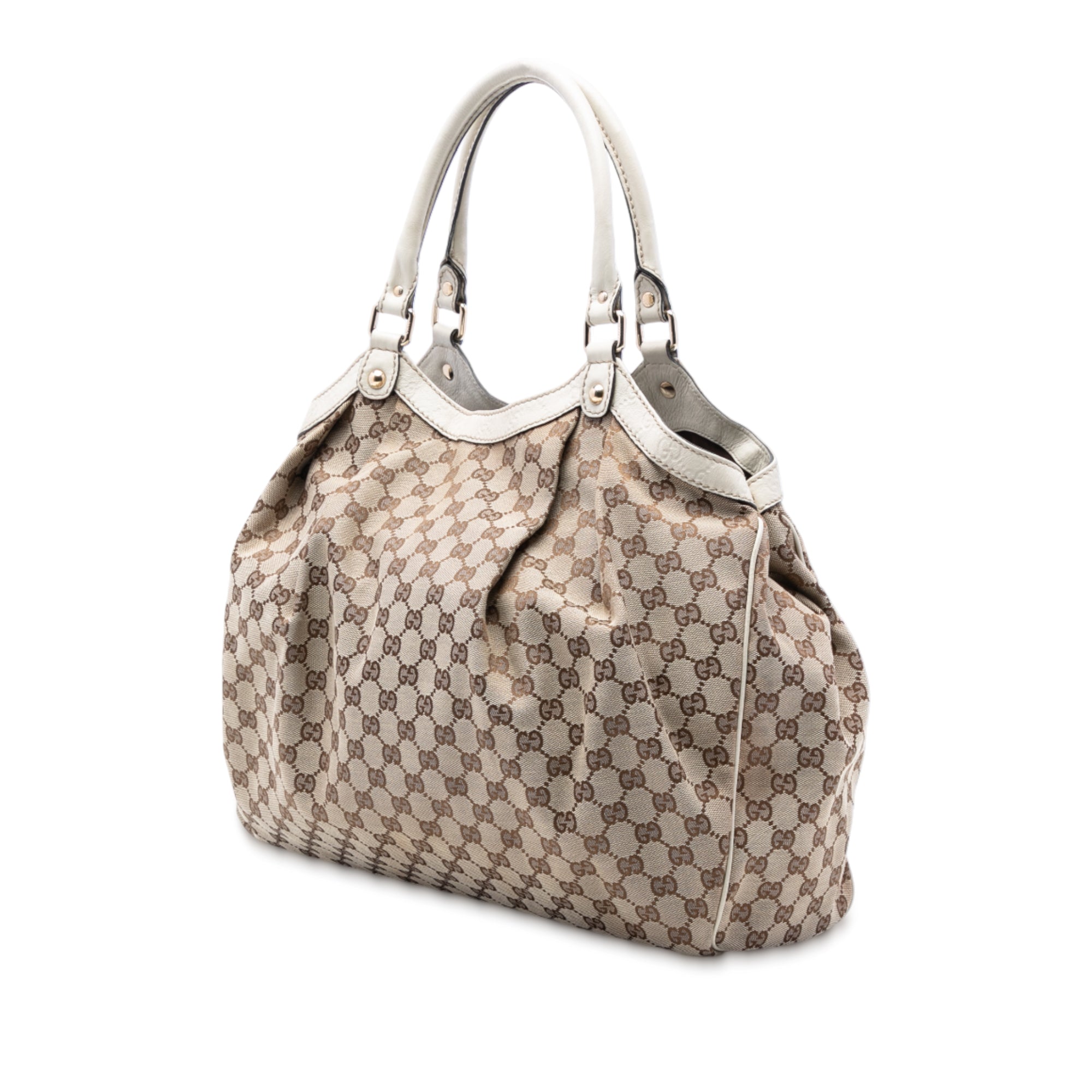 Le Gucci Large GG Canvas Sukey Tote associe la toile iconique GG à des finitions en cuir raffiné pour créer un sac de tous les jours à l'allure souveraine. Le corps structuré présente le monogramme typique, tandis que les anses roulées en cuir assurent une prise en main agréable à la main ou à l'avant-bras. Les lignes épurées et les accents métalliques discrets soulignent le style classique de Gucci avec une élégance intemporelle.