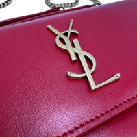 Cette Yves Saint Laurent Kate a été fabriquée en cuir de veau rouge finement texturé. Le logo YSL emblématique sur le devant brille dans la même teinte dorée que la lanière de chaîne. C'est par le biais de cette dernière que la sac de préférence portée crossbody. Le sac possède un rabat frontal avec une fermeture magnétique à déclic et une poche intérieure. Très pratique et élégant à la fois, ce sac à une multitude de tenues.