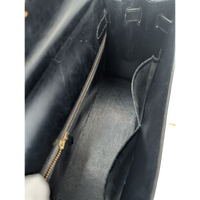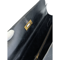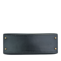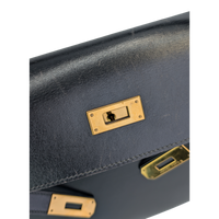 Le Hermès Kelly est probablement l'un des sacs à main les plus célèbres au monde. Avec sa forme simple et incomparable et son bouchon à vis typique, il est facile à reconnaître. Fabriqué à partir du meilleur cuir de veau box, le noir profond s'harmonise à merveille avec l'or du fermoir. A l'intérieur il y a un compartiment zippé et deux compartiments ouverts.