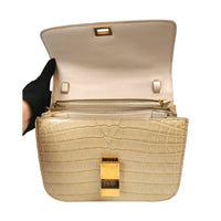 La boîte Céline Classic est l'un des modèles les plus populaires de la maison française de tradition. Cet exemplaire est fabriqué en crocodile beige et dispose d'un matériel doré. Le site sac sécurisé par une fermeture à bouton-pression sous le rabat sur le devant. L'intérieur est revêtu de cuir d'agneau très fin et dispose de deux poches et d'une poche zippée. Grâce à lui, on peut sac peut être porté à l'épaule ou en bandoulière.