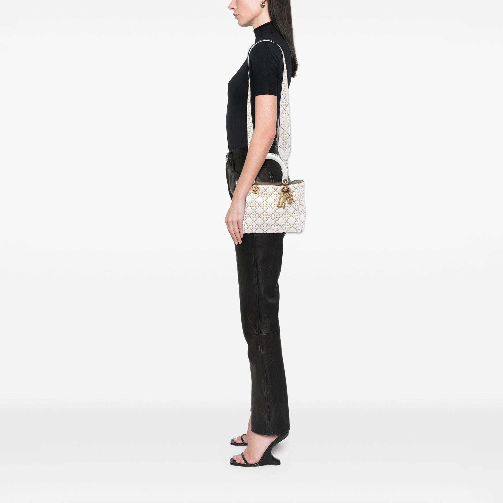 Le Dior Medium Lambskin Cannage Studded Supple Lady Dior réinterprète la ligne emblématique Lady Dior avec une silhouette au tombé souple et le motif piqué caractéristique du cannage. Le cuir d'agneau souple constitue la base, tandis que des rivets discrets confèrent au design une texture moderne. Les doubles anses structurées assurent une prise en main élégante, complétée par les Tag typiques de Dior qui se balancent subtilement lorsqu'on les bouge.