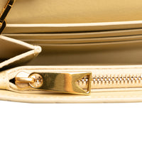Questo portafoglio con catena di Bottega è stato realizzato con la famosa pelle Intrecciato nel colore beige. Ha una patta frontale con chiusura magnetica e scomparti interni con cerniere e tasche a bustina. Può essere indossata comodamente crossbody.