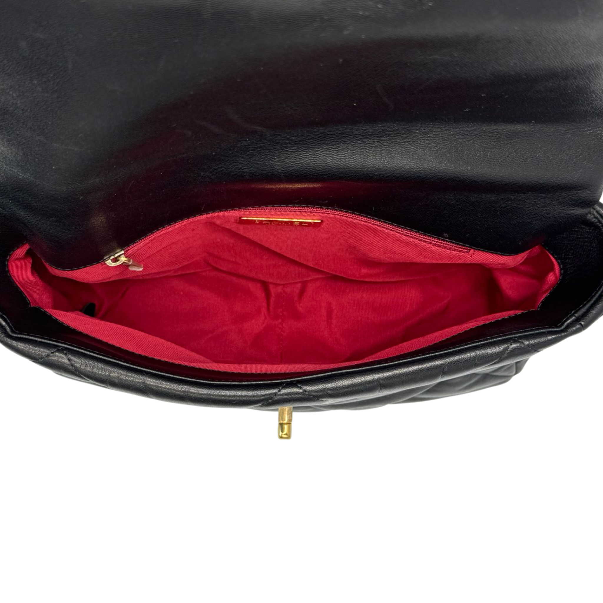 La borsa Chanel 19 con patta nella taglia Large colpisce per la lussuosa pelle di agnello nera, un sorprendente manico a catena e un cinturino in pelle intrecciata per il trasporto a spalla. La patta con l'iconico twist lock CC, il pratico scomparto esterno e uno scomparto interno con cerniera uniscono stile e funzionalità ai massimi livelli. Un classico dal carisma urbano e dal massimo impatto.