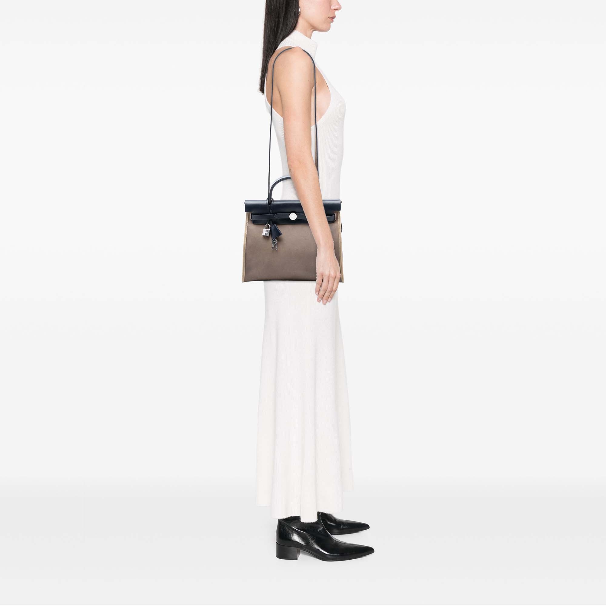 Die Hermès Toile Herbag Zip 31 verbindet die klare Linienführung eines klassischen Flap-Designs mit einer leichten, strukturierten Silhouette. Der Korpus aus robustem Canvas wird durch Lederbesatz akzentuiert und erhält so eine elegante, zugleich alltagstaugliche Ausstrahlung. Charakteristisch sind die Überschlagklappe mit Durchzugriemen, die formstabile obere Kante sowie die dezent integrierte Clochette, die den typischen Hermès-Stil unterstreicht.