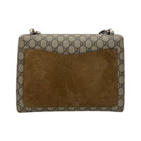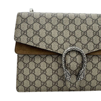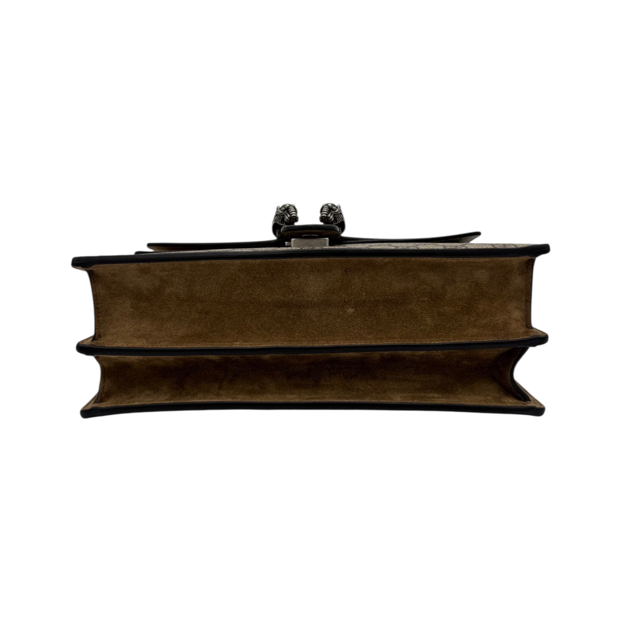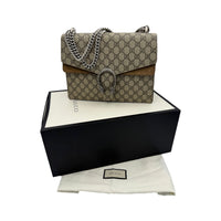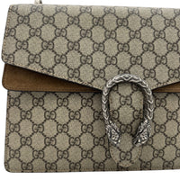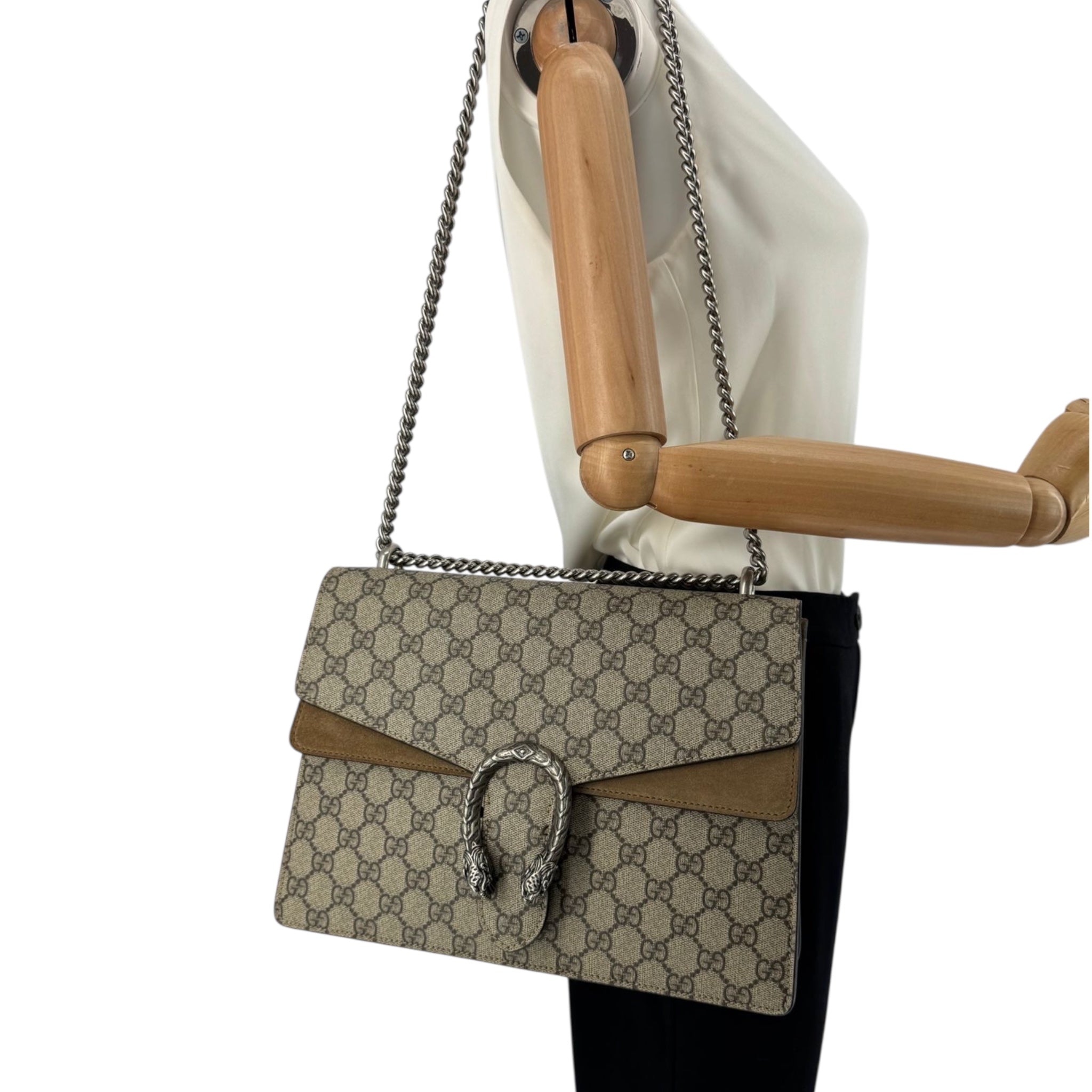 Dioniso, il dio greco del vino e della gioia, è l'ispirazione per l'omonima collezione Gucci. La chiusura della testa di tigre sulla patta di questo borsa Le dimensioni ridotte si riferiscono alla leggenda secondo la quale Dioniso avrebbe attraversato il Tigri su una tigre inviata da Zeus. D'altro canto, la forma a ferro di cavallo della fibbia crea un riferimento allo sport equestre, vicino alla maison italiana. Il borsa è indossato sopra la spalla. Presenta una tracolla a catena color argento, una patta con chiusura a scatto e uno scomparto interno con zip.