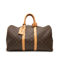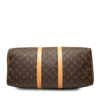 Il Louis Vuitton Keepall 45 è un vero classico nella collezione di borse da viaggio Louis Vuitton. Questo esempio è realizzato con la classica tela Monogram marrone scuro. Quello spazioso borsa presenta una doppia cerniera in ottone color oro sull'apertura superiore. I manici marrone chiaro e le rifiniture in pelle Vachetta creano il tipico look Louis Vuitton. Un ottimo compagno per un viaggio nel fine settimana.
