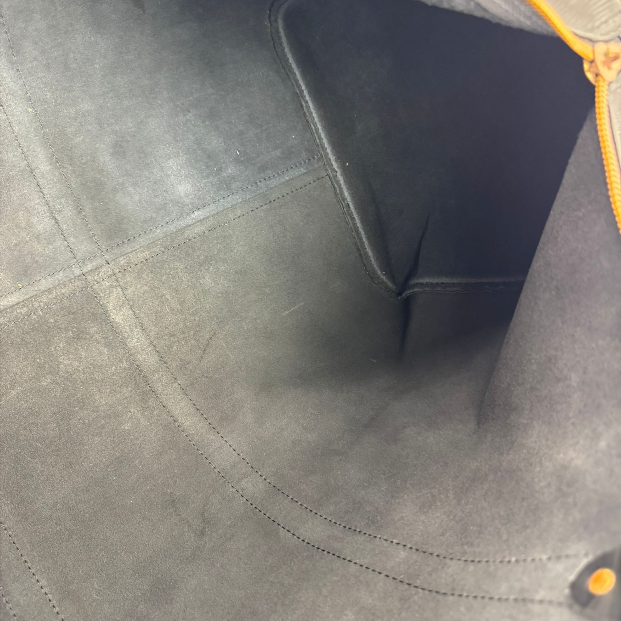Condizione: L'esterno mostra borsa Pieghe sottili e scolorimenti individuali sul retro e sul davanti. Gli angoli mostrano una leggera usura. Il manico presenta rughe, segni di usura e piccolo scolorimento. C'è un leggero scolorimento all'interno.