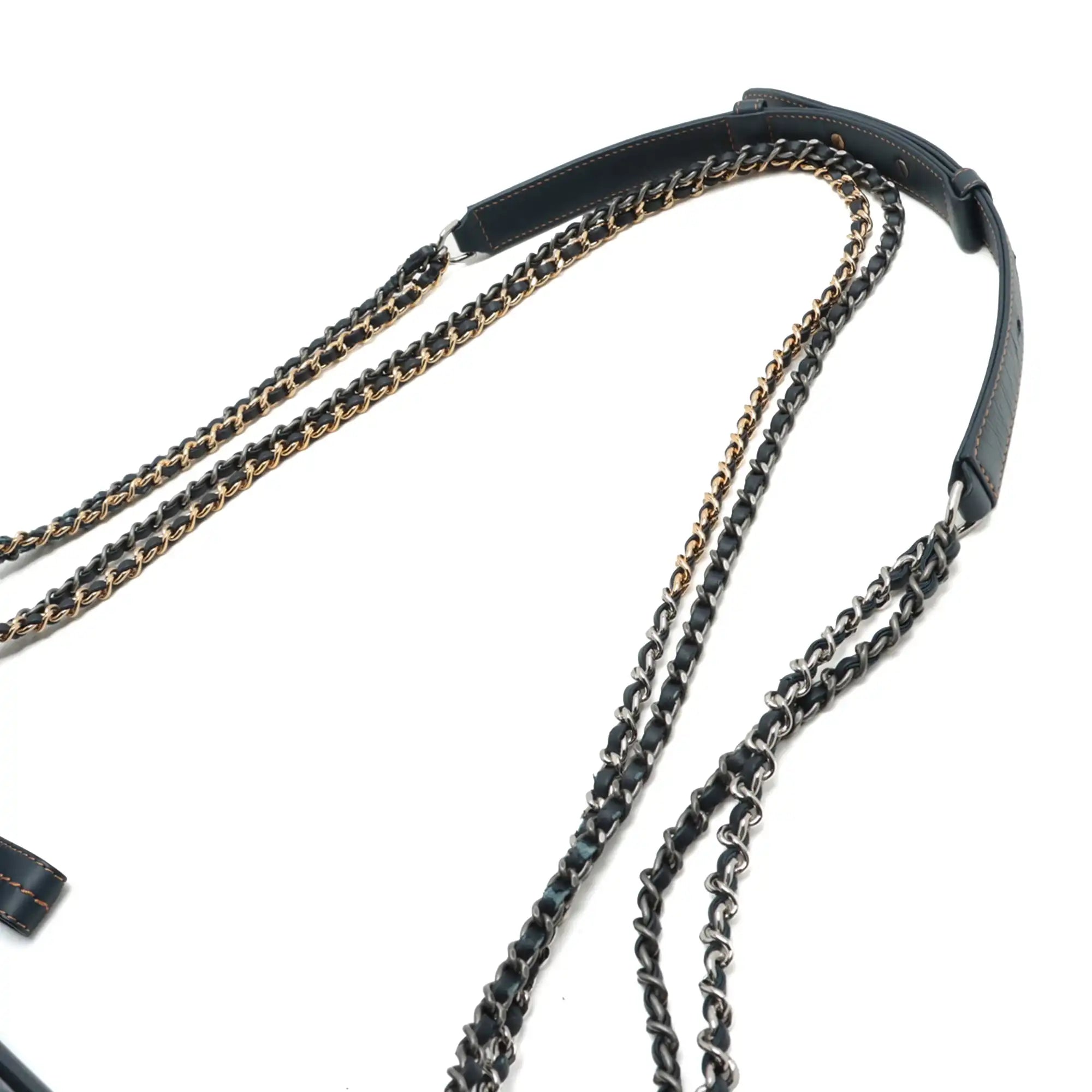 La Gabrielle è realizzata in tweed blu con finiture in pelle, tracolla a catena in pelle intrecciata, protezione in pelle regolabile, chiusura superiore con cerniera e tasche interne con cerniera e bustina. È meglio indossarlo liberamente sopra la spalla.