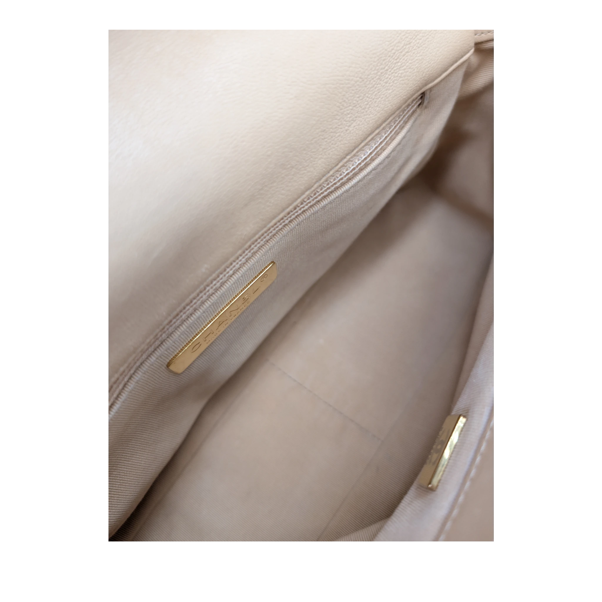 Zustand: Guter getragener Zustand. Das Lambskin ist angenehm weich und weist eine schöne, natürliche Patina auf. Leichter Abrieb an Ecken und Kanten sowie auf der Rückseite durch normales Tragen. Vereinzelte kleine Flecken sichtbar. Das eingeflochtene Leder im CC Logo zeigt ebenfalls leichte Gebrauchsspuren. Innen sauber mit vereinzelten, dezenten Flecken.