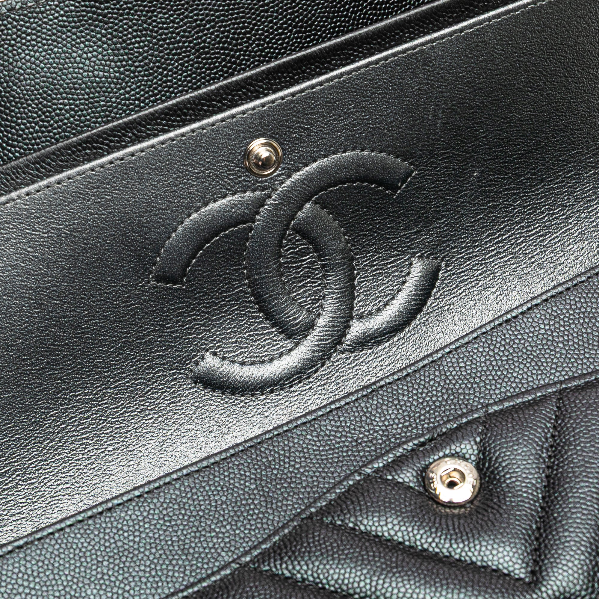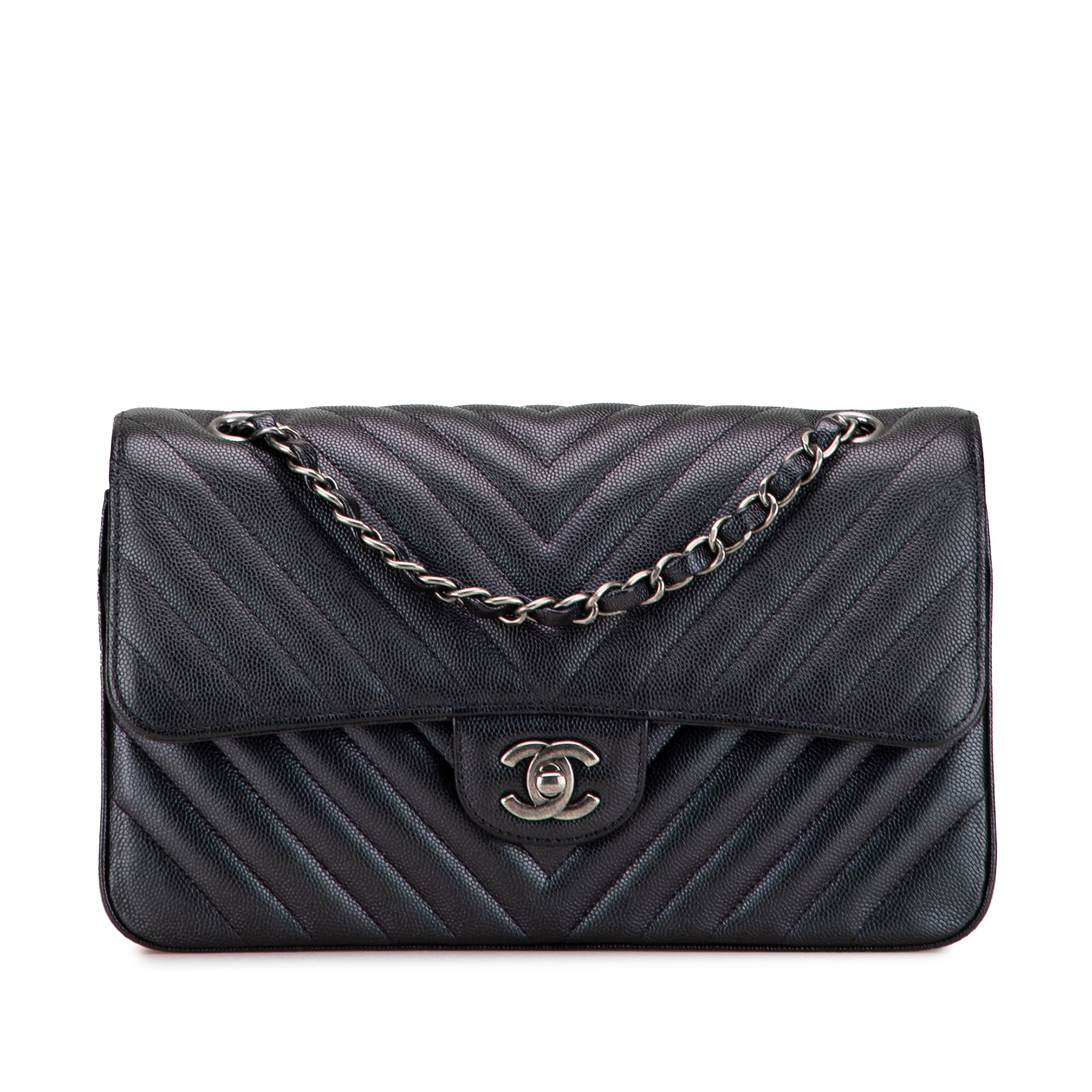 Die Chanel Medium Classic Chevron Caviar Double Flap ist eine ikonische Schultertasche mit markantem Chevron-Steppmuster und der charakteristischen Double-Flap-Konstruktion. Gefertigt aus genarbtem Caviar-Leder verbindet das Modell eine strukturierte Optik mit alltagstauglicher Robustheit. Das Leder- und Kettenriemen-Design mit eingewobenem Leder sorgt für einen eleganten Fall, während das CC-Drehschloss die Frontklappen stilvoll schliesst.