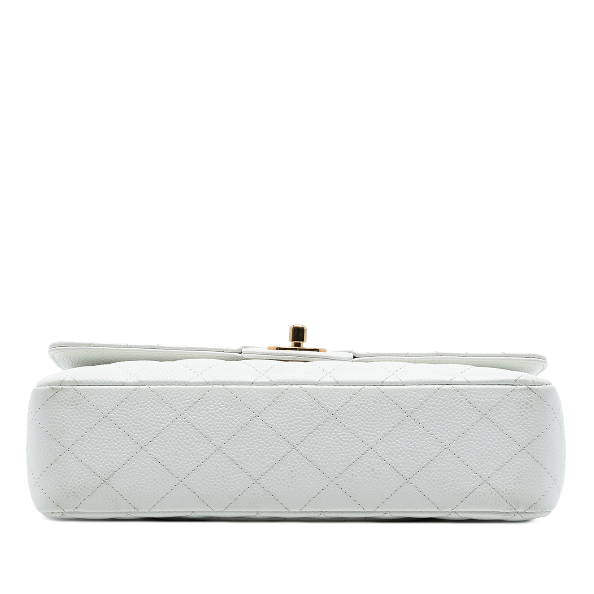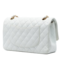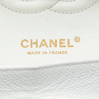Die Chanel Medium Classic Caviar Double Flap ist eine zeitlose Schultertasche mit klarer, ikonischer Linienführung. Der gesteppte Korpus aus Caviar-Leder verleiht Struktur und eine dezente Textur, während die metallene Kette mit Lederdurchzug sowohl elegant als auch angenehm zu tragen ist. Charakteristisch sind die doppelte Frontklappe mit dem CC-Verschluss und der Drehverschluss, die das klassische Design prägen.