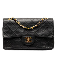Die Chanel Small Classic Lambskin Double Flap ist eine ikonische Schultertasche mit fein gesteppter Lammleder-Oberfläche und der charakteristischen Ketten-Schulterriemenkonstruktion, in die Leder eingeflochten ist. Das Modell zeigt zwei Frontklappen mit dem ineinandergreifenden CC-Emblem und einem Drehverschluss, wodurch die Silhouette klar und ausgewogen wirkt. Eine flache Aussentasche auf der Rueckseite ergänzt das klassische Design um ein dezentes, praktisches Detail.