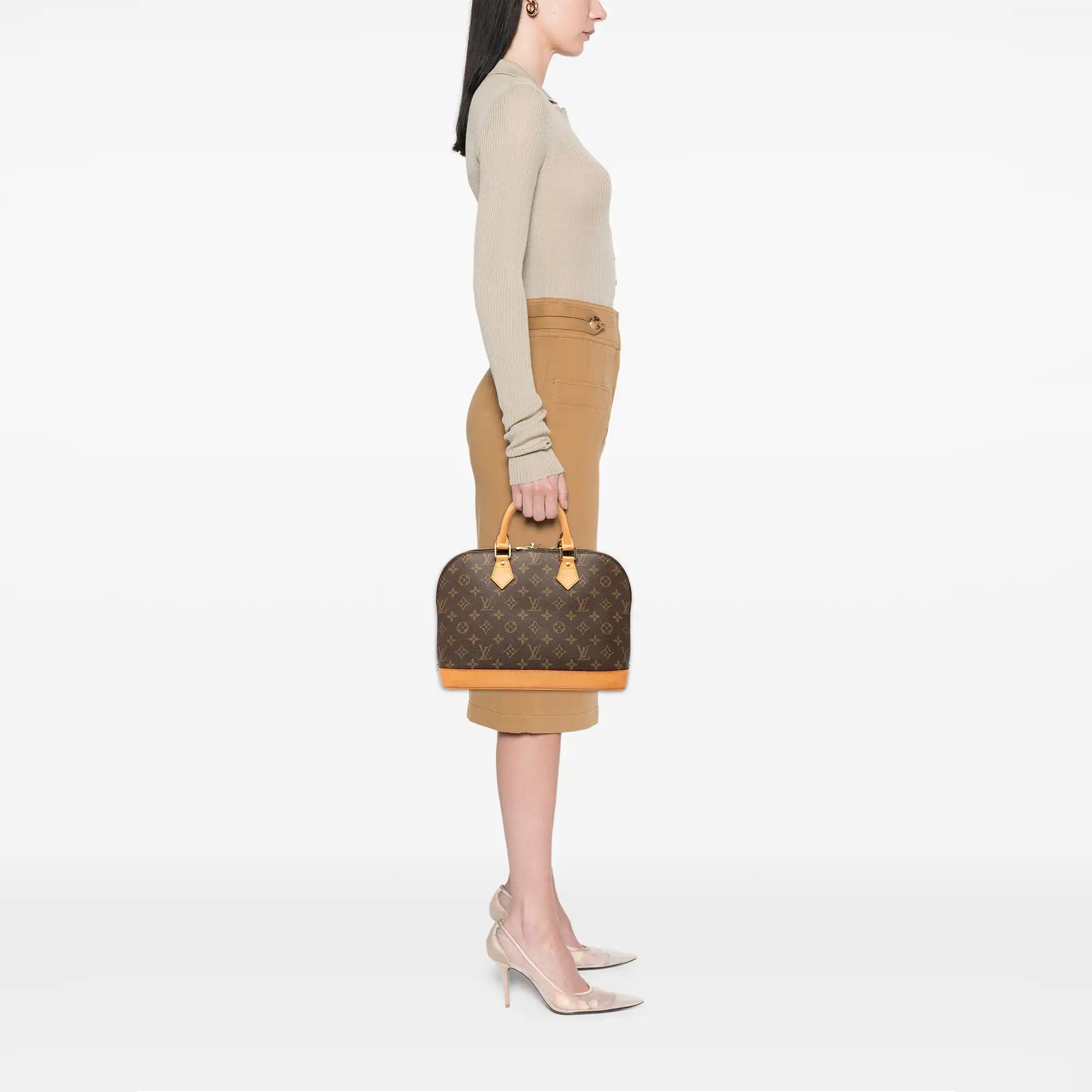 Das Alma Modell wurde erstmals im Jahre 1934 lanciert und gehört damit zu den Klassikern des Modehauses. Dieses elegante Modell im beliebten Monogram Canvas hat handvernähte Griffe, Besätze aus dunkelbraunem Rindsleder und goldfarbene Beschläge. Sie kann entweder in der Hand oder am Ellbogen getragen werden.