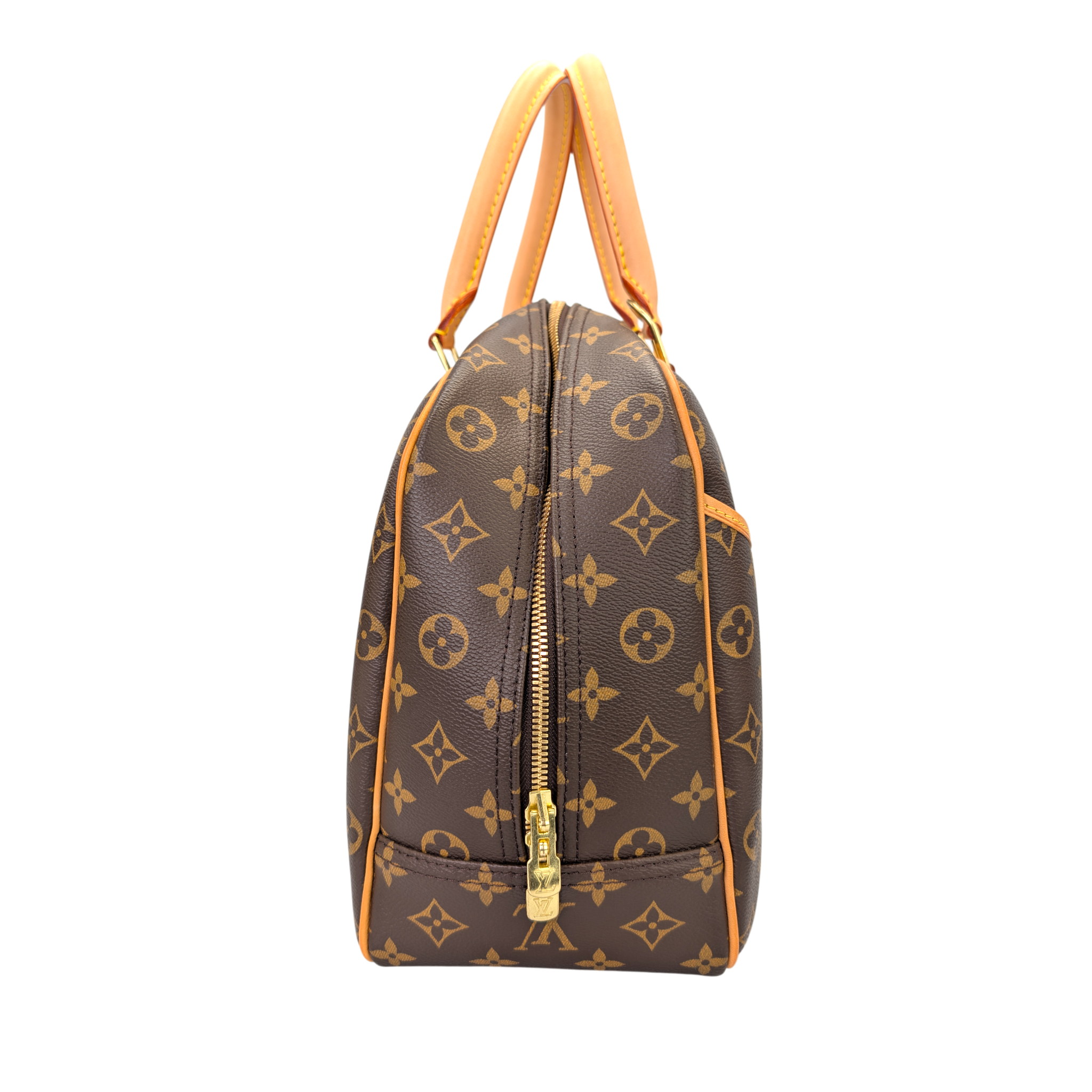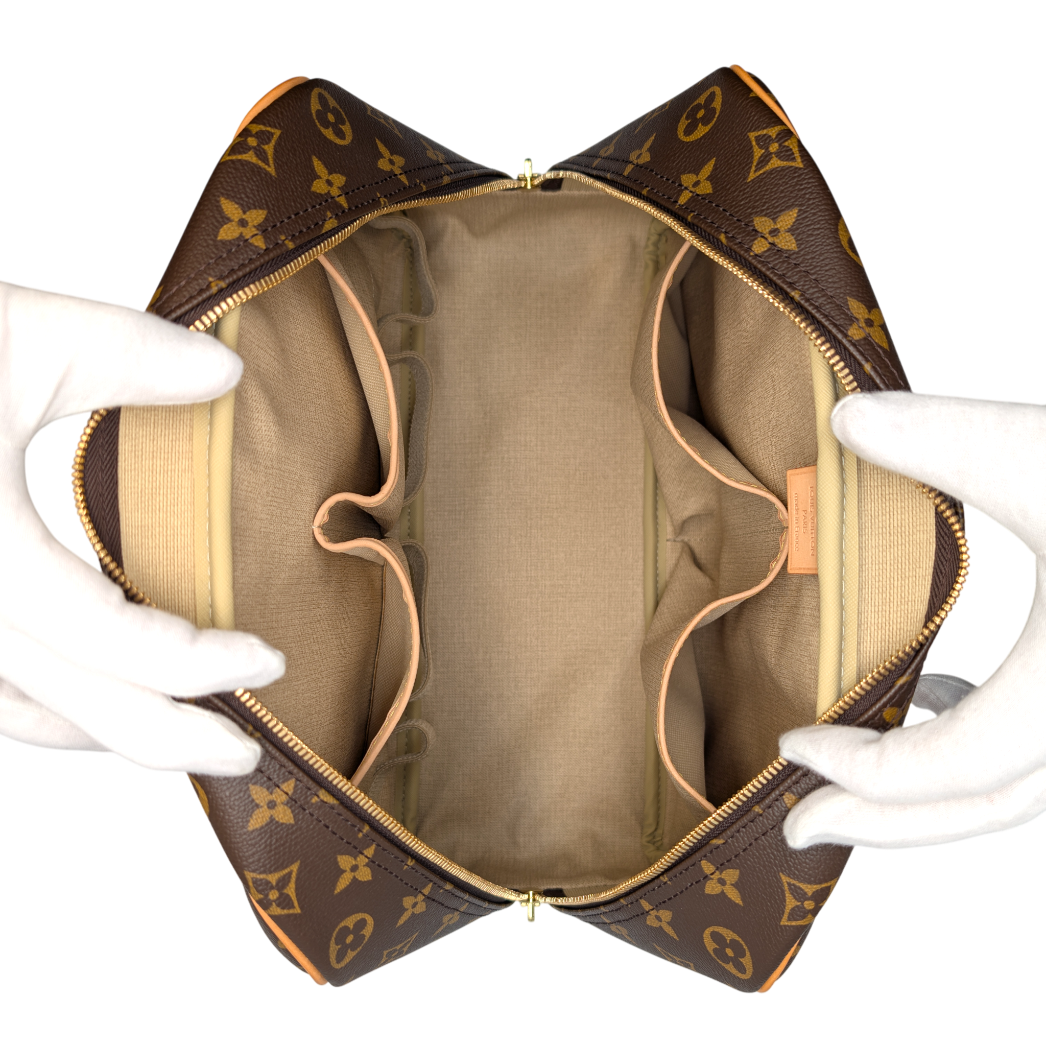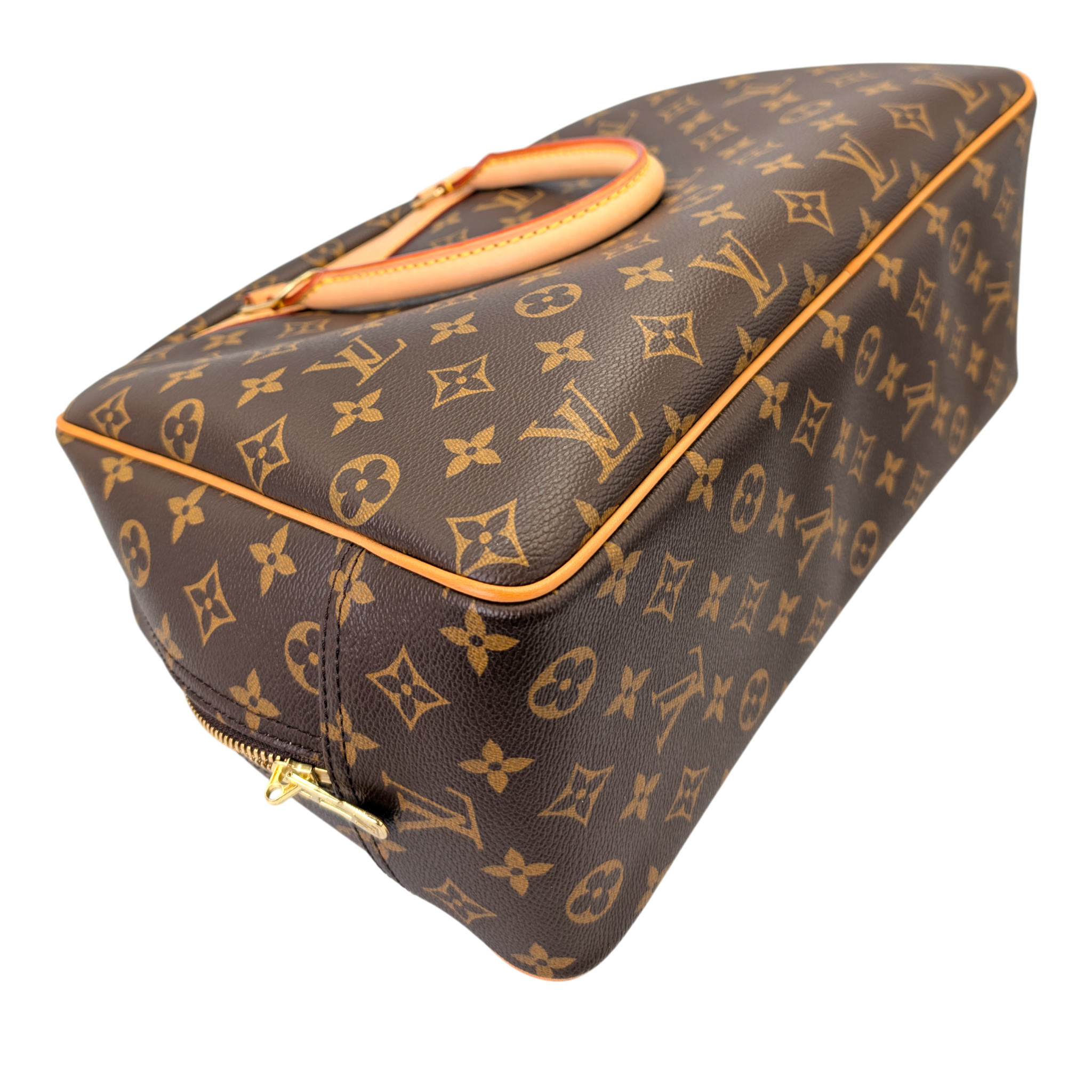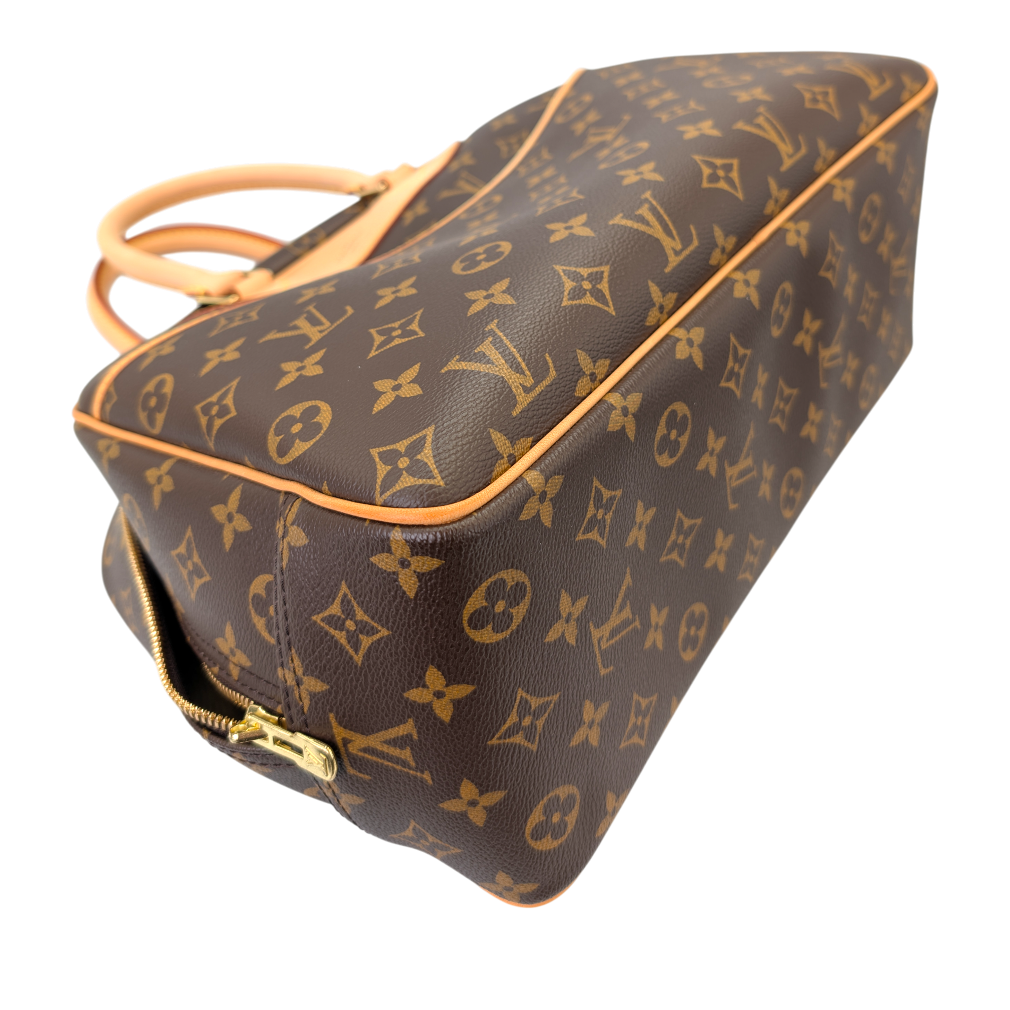 Die Louis Vuitton Deauville im ikonischen Monogram Canvas ist ein klassisches Vintage-Modell der Maison und überzeugt durch ihre strukturierte, elegante Silhouette. Ursprünglich als luxuriöse Beauty- und Vanity-Tasche konzipiert, bietet sie dank ihrer stabilen Form und des umlaufenden Reissverschlusses optimalen Überblick und Funktionalität. Die hell patinierte Vachetta-Lederverarbeitung bildet einen harmonischen Kontrast zum Monogram Canvas und unterstreicht den zeitlosen Charakter dieses Modells.