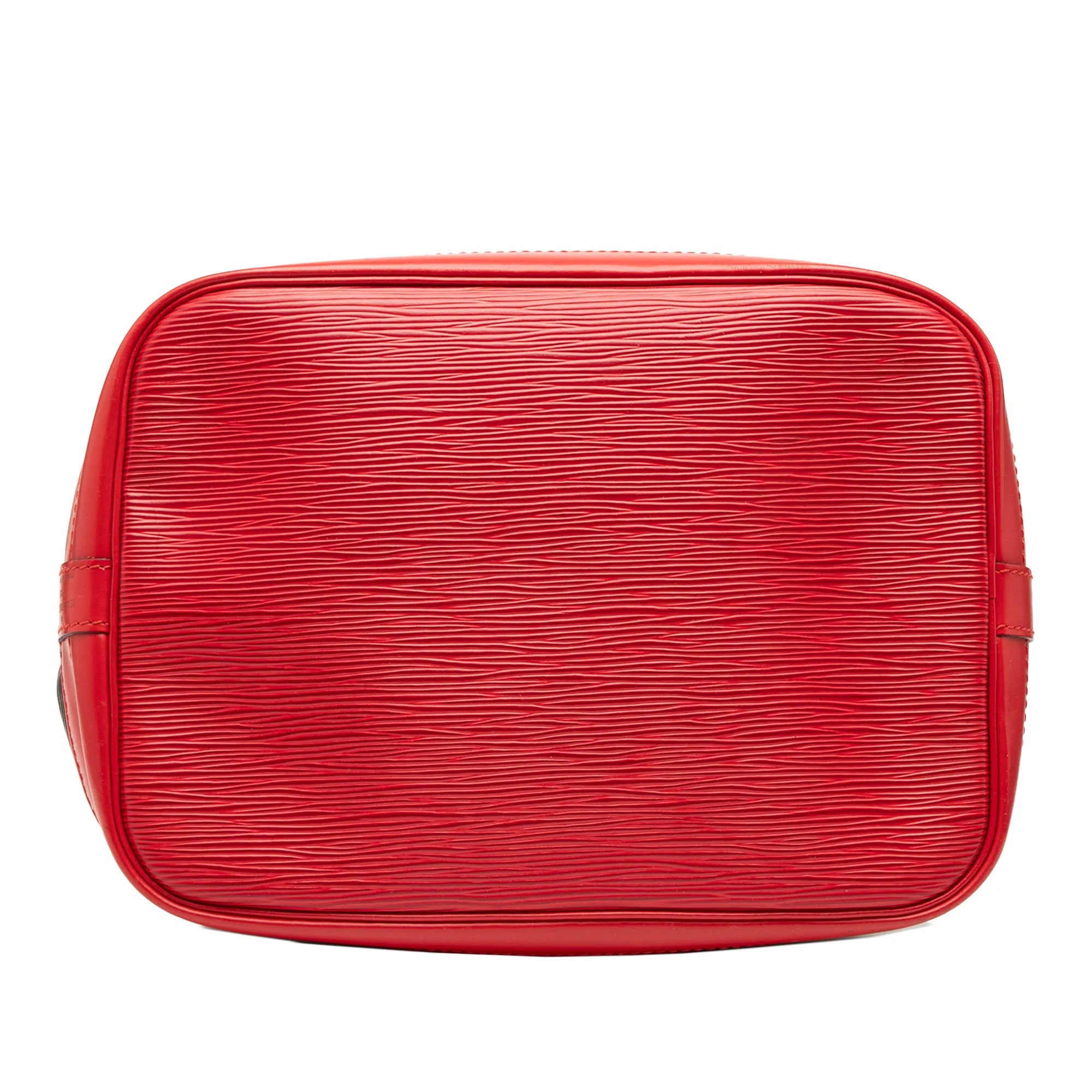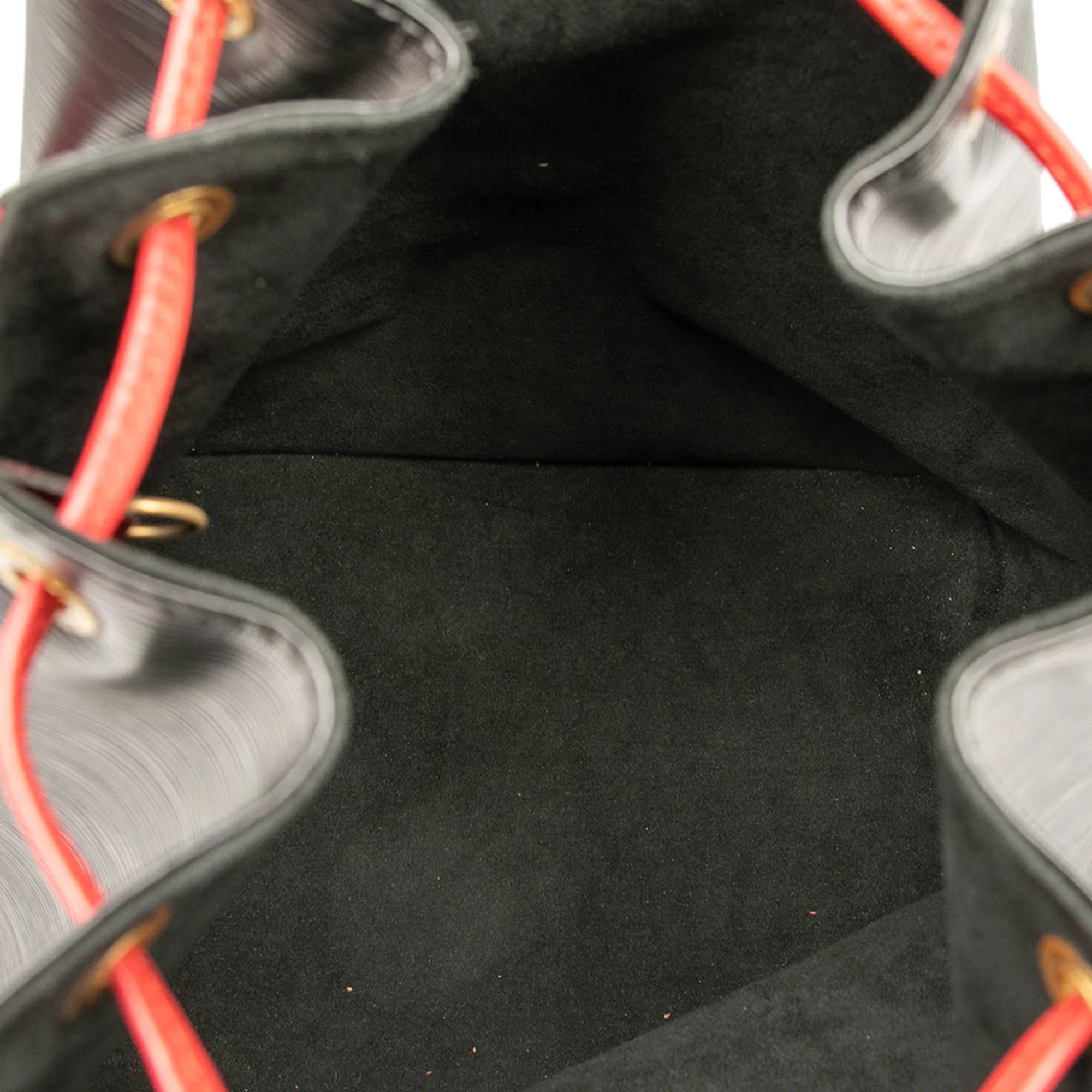 Die Taschen aus Louis Vuitton's Noé Reihe gehören zu den einprägsamsten Taschen des Hauses. Diese Louis Vuitton Grand Noé wurde aus schwarzem und rotem Bicolor Epi Leder gefertigt und besitzt goldene Details, einen Kordelzug mit einem Lederband an der oberen Öffnung und ein Alcantara Futter. Die Tasche wird am besten nahe der Schulter getragen.