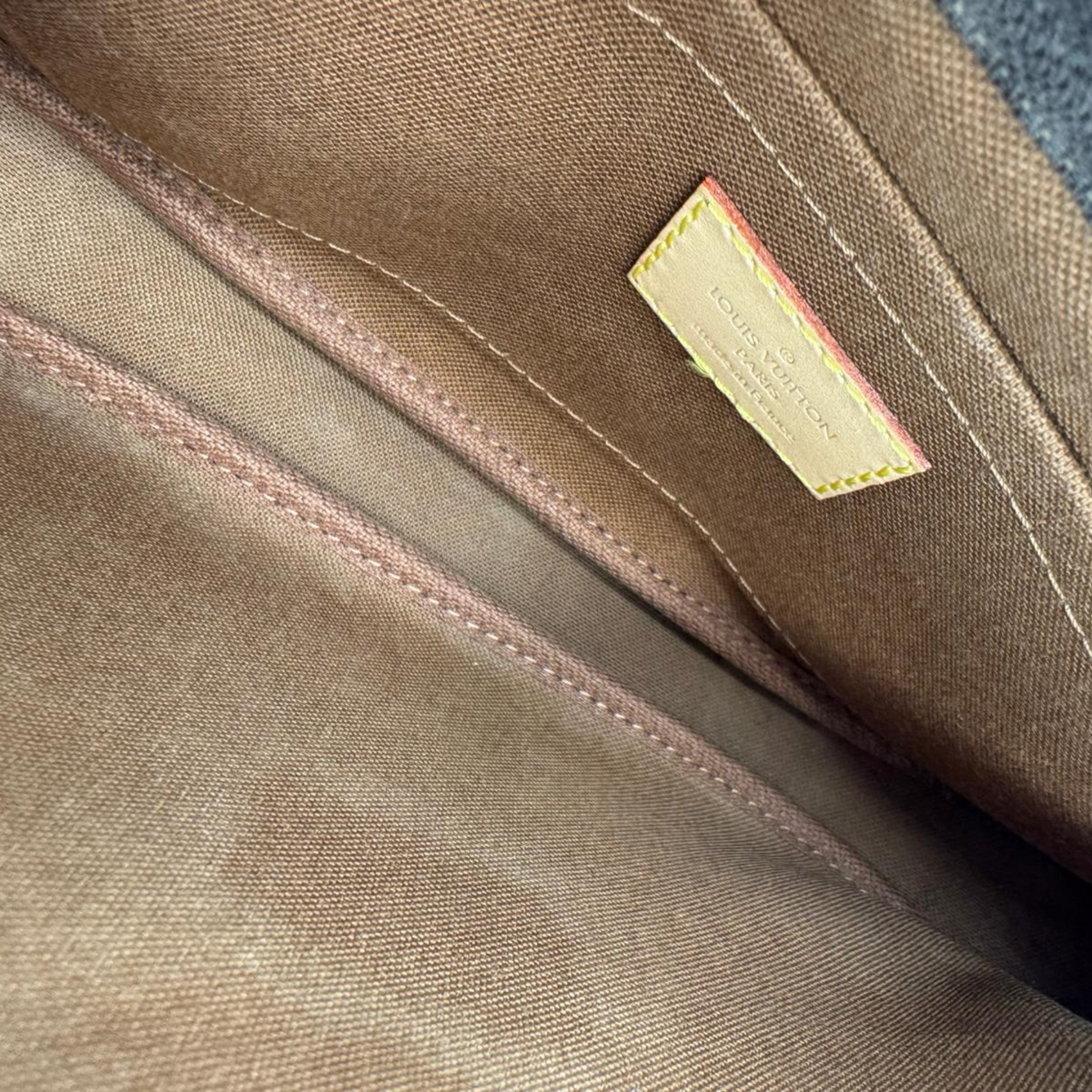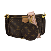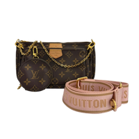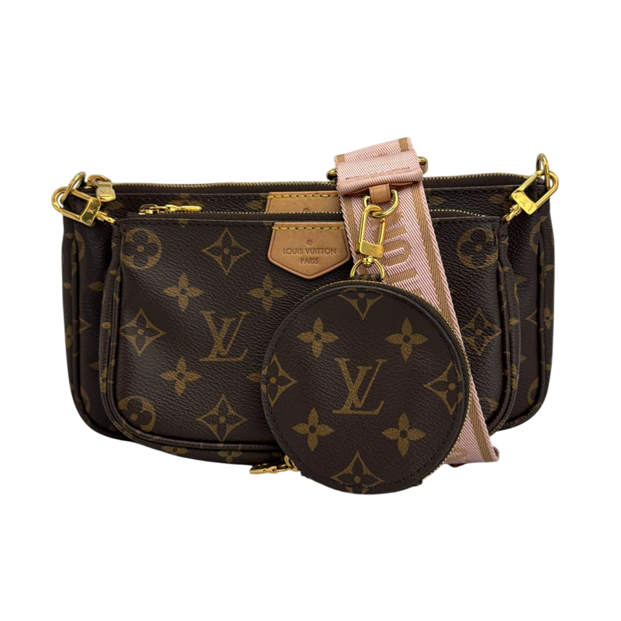 Die Louis Vuitton Multi Pochette Accessoires ist eine dieser Taschen, bei denen man sich fragt, wie man je ohne sie auskommen konnte. Drei Lieblingsstücke in einem - eine Pochette Accessoires, eine Mini Pochette und eine runde Münzbörse - alles aus ikonischem Monogram Canvas, perfekt kombiniert. Der breite Jacquard-Riemen in feinem Pink ist nicht nur ein Hingucker, sondern auch unglaublich praktisch: verstellbar, abnehmbar und angenehm zu tragen. Dazu eine goldfarbene Kette für den eleganten Auftritt am Abend. Ob Alltag oder Ausgehen - hier stimmt einfach alles. Und ja: Man darf sich ein bisschen in sie verlieben.